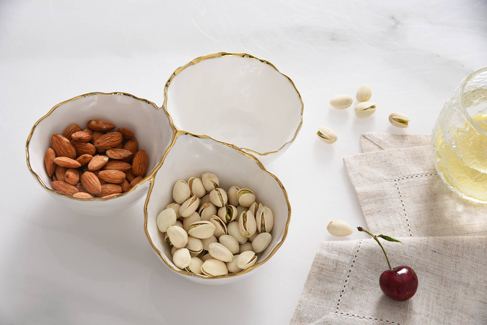 3 Section Server in porcelain and gold. This server provides seamless options for presenting condiments, snacks, dips, or other accompaniments with ease. Made from premium white porcelain, each section is adorned with a delicate gold trim that exudes sophistication and charm. Designed for both beauty and functionality, this piece is a fabulous addition for entertaining or everyday use.