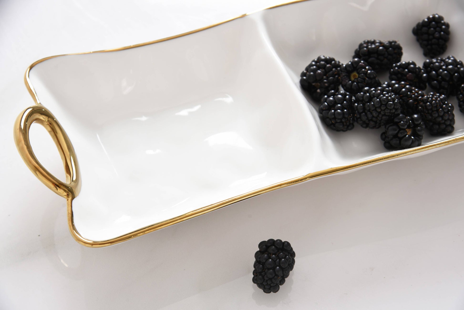 3 Section Server in fabulous white and gold porcelain. Get creative! This piece is great for serving different combinations of snacks, dips and vegetables or all your Tex-Mex needs like guacamole, sour cream and pico de gallo. Gleaming white porcelain with smooth and graceful rim and handles in gold.