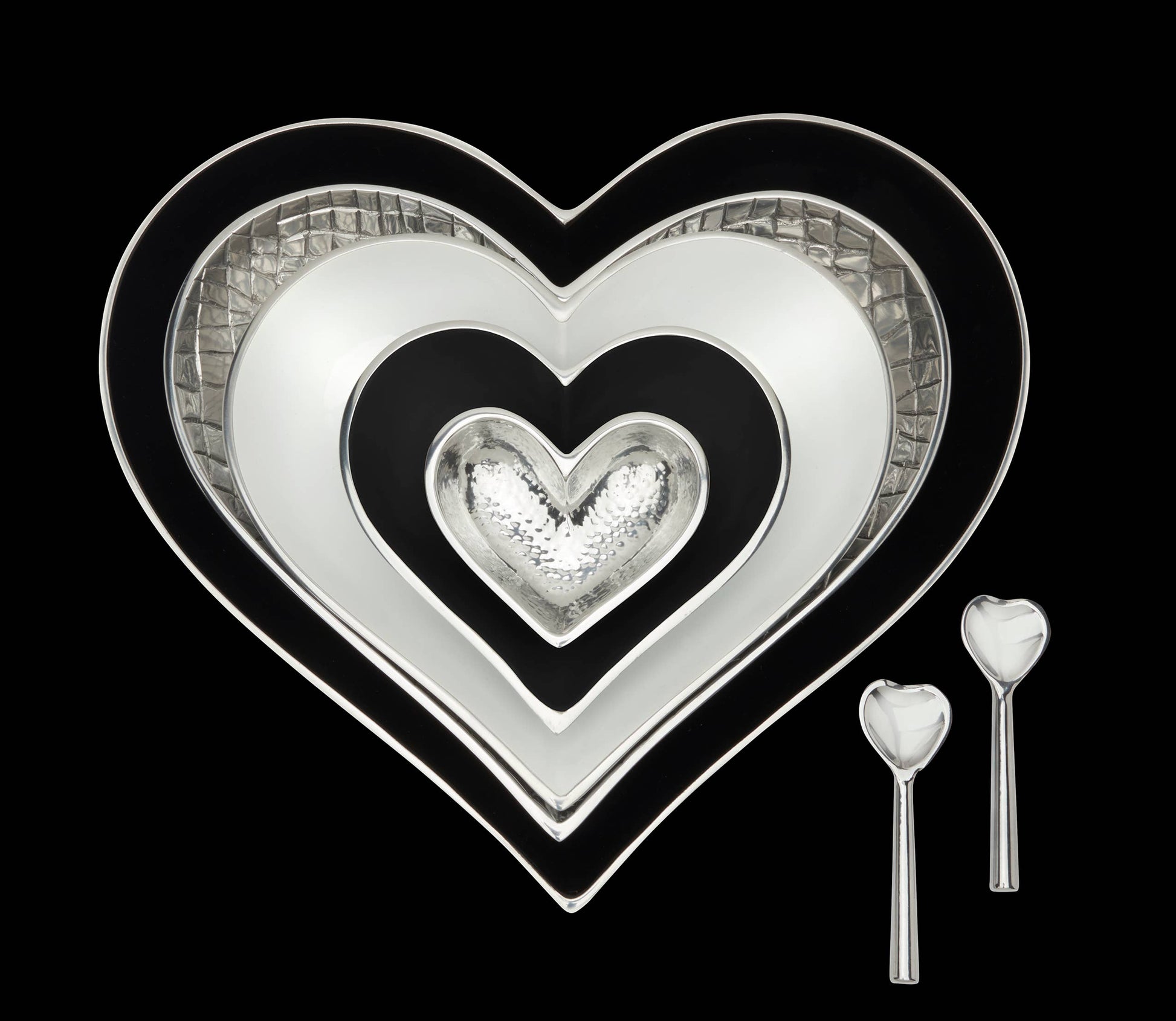 Gotta do things in a BIG way?! We've got you covered 5-times over! This fabulous set of five nesting heart bowls comes with two shiny Lil Heart Spoons. Use as your heart desires! Hearts range in size from 4"-14". (The smallest one is our 4" Tiny Heart. The next size up is our 5" Happy Heart.) Heart Colors: Shiny Black, Croco Silver, Shiny White, Shiny Black & Hammered Silver. Handcrafted of food-safe polished aluminum.