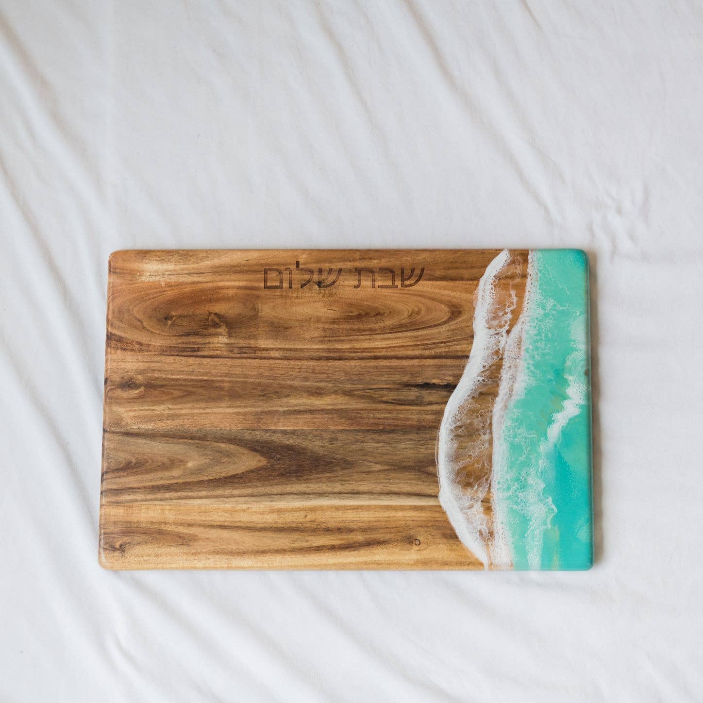 These pieces are handmade from high quality Acacia wood accented with an eco-friendly epoxy to create a one-of-a-kind piece of serveware for your home. This challah board comes in a variety of colors to match your customer's table setting. Elegantly engraved Hebrew saying Shabbat Shalom makes a beautiful presentation for Shabbot. Underneath the edges are small indents so the board can be lifted easily from the table.