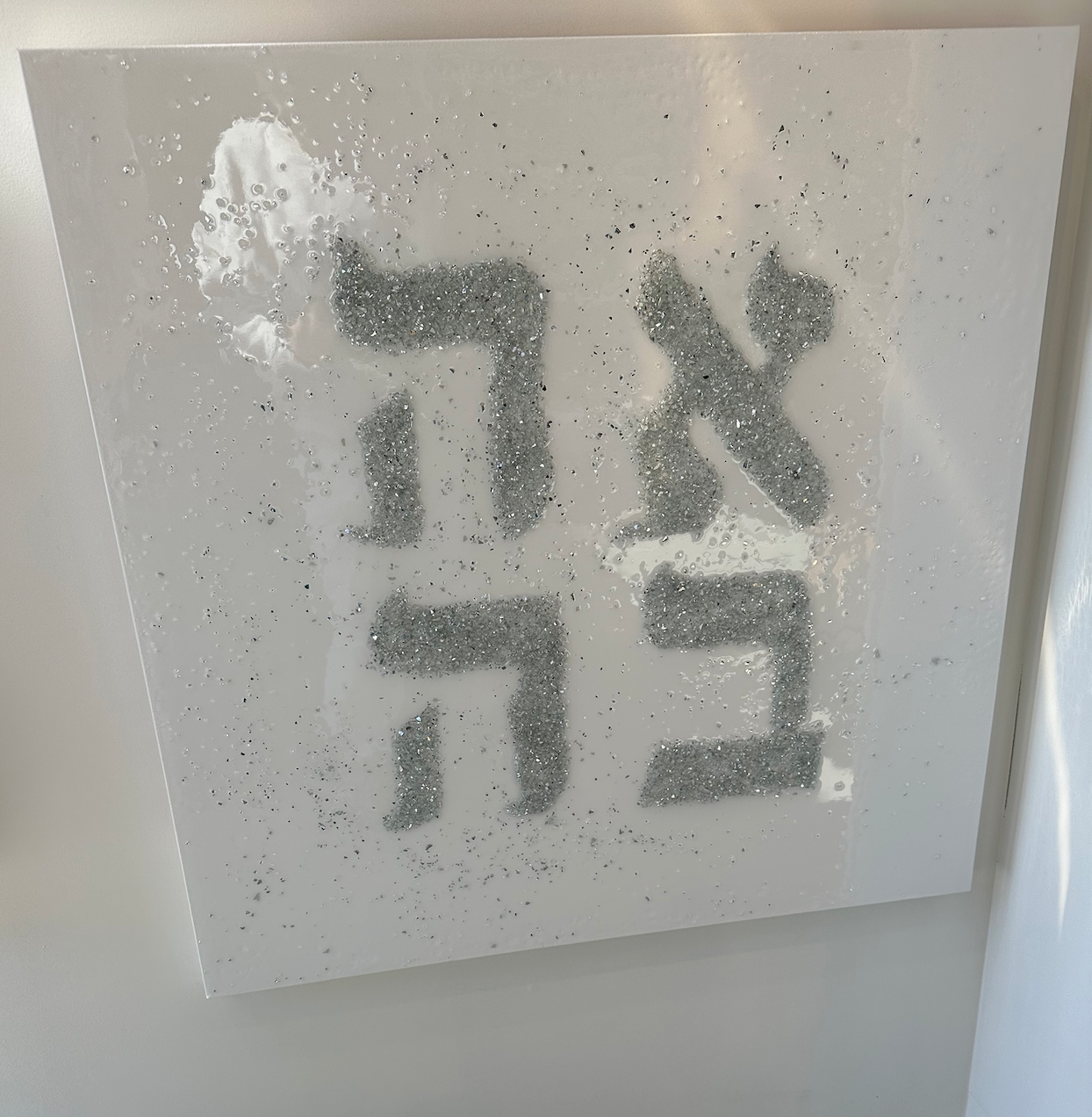 "Ahava" meaning "Love" in Hebrew. Vibrant resin art piece by New York base artist K.Smith. Crafted from crushed glass on canvas and embellished resin. This one of a kind has Smith's side engraved canvas with meaningful wording which adds depth and emotion to this sought after piece.
