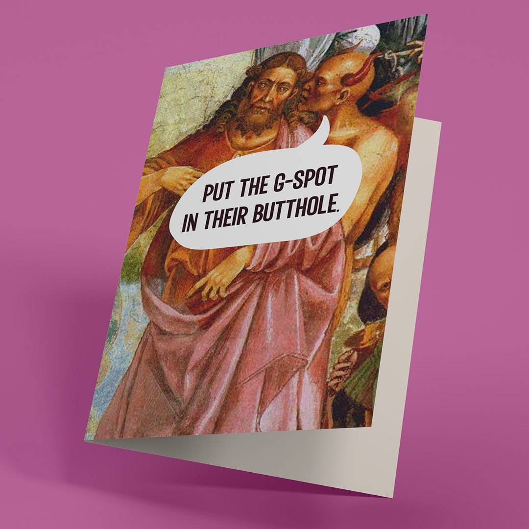 For those who love a little shock factor in their humor, our "G-Spot Whisper" card is sure to get a reaction! Featuring a classical painting of a demon whispering to the Lord, with the hilarious line, "Put the g-spot in their butthole." This card is perfect for friends with a bold sense of humor who appreciate how to hit the spot.