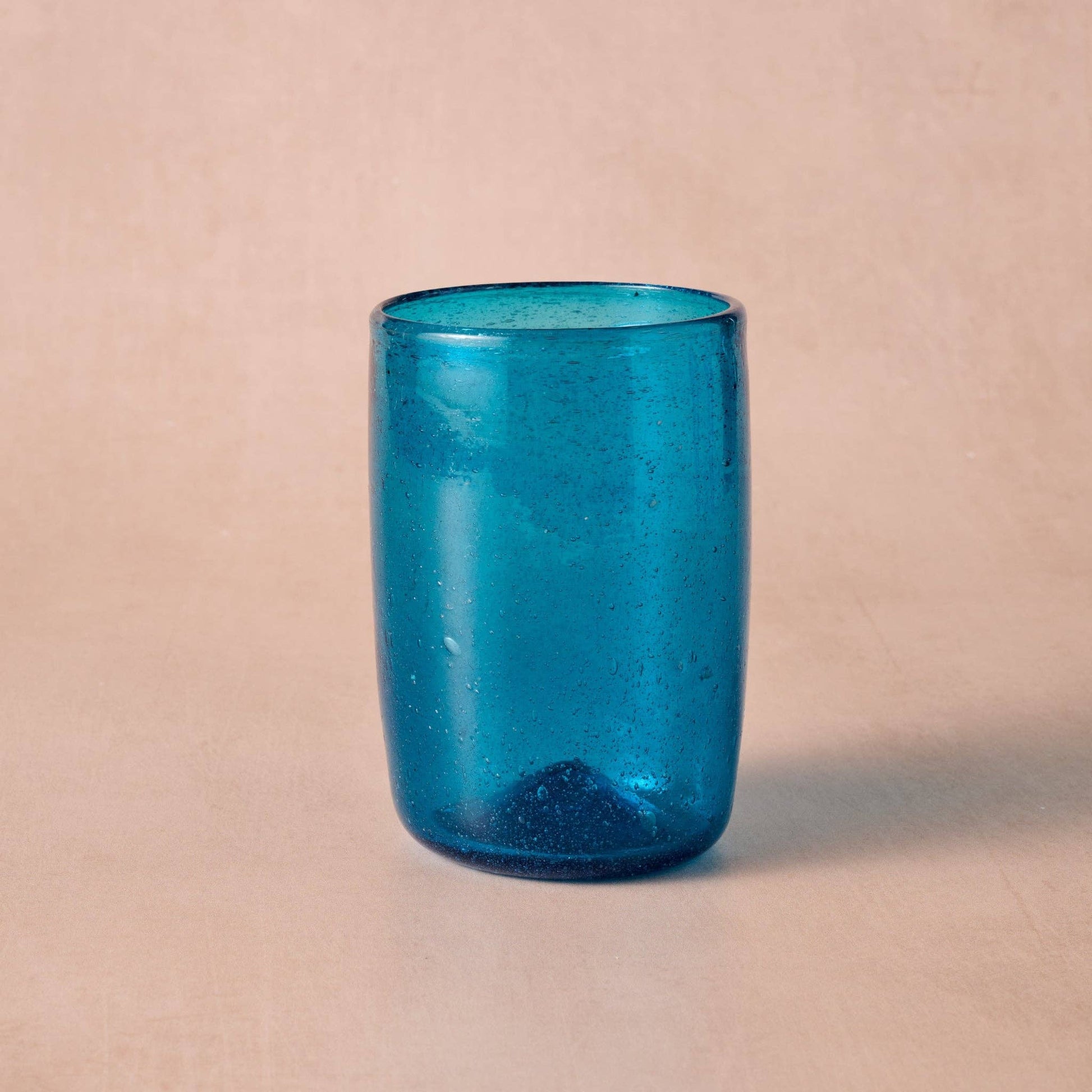 Enjoy your hydration in style with this handcrafted carafe and cup set made from recycled glass. The rounded base of the gorgeous blue carafe tapers elegantly into a slim neck topped by a matching drinking glass that doubles as a lid keeping water fresh and dust-free. Thoughtfully designed and perfect for your bedside table, office or guest room, this two-piece set blends functionality with artisan charm. Handcrafted in Egypt. Materials: Recycled glass - Measures: 9.5"H x 5.5"W - Colors: Blue - Care: Dishwasher safe - Notes: Safe for food. Use with room temperature + cold beverages only - Handcrafted in Egypt