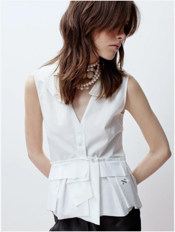 Scalloped collar with a light gold embroidery and imprinted flowers. Irregular & raw edge hem detail finishing.