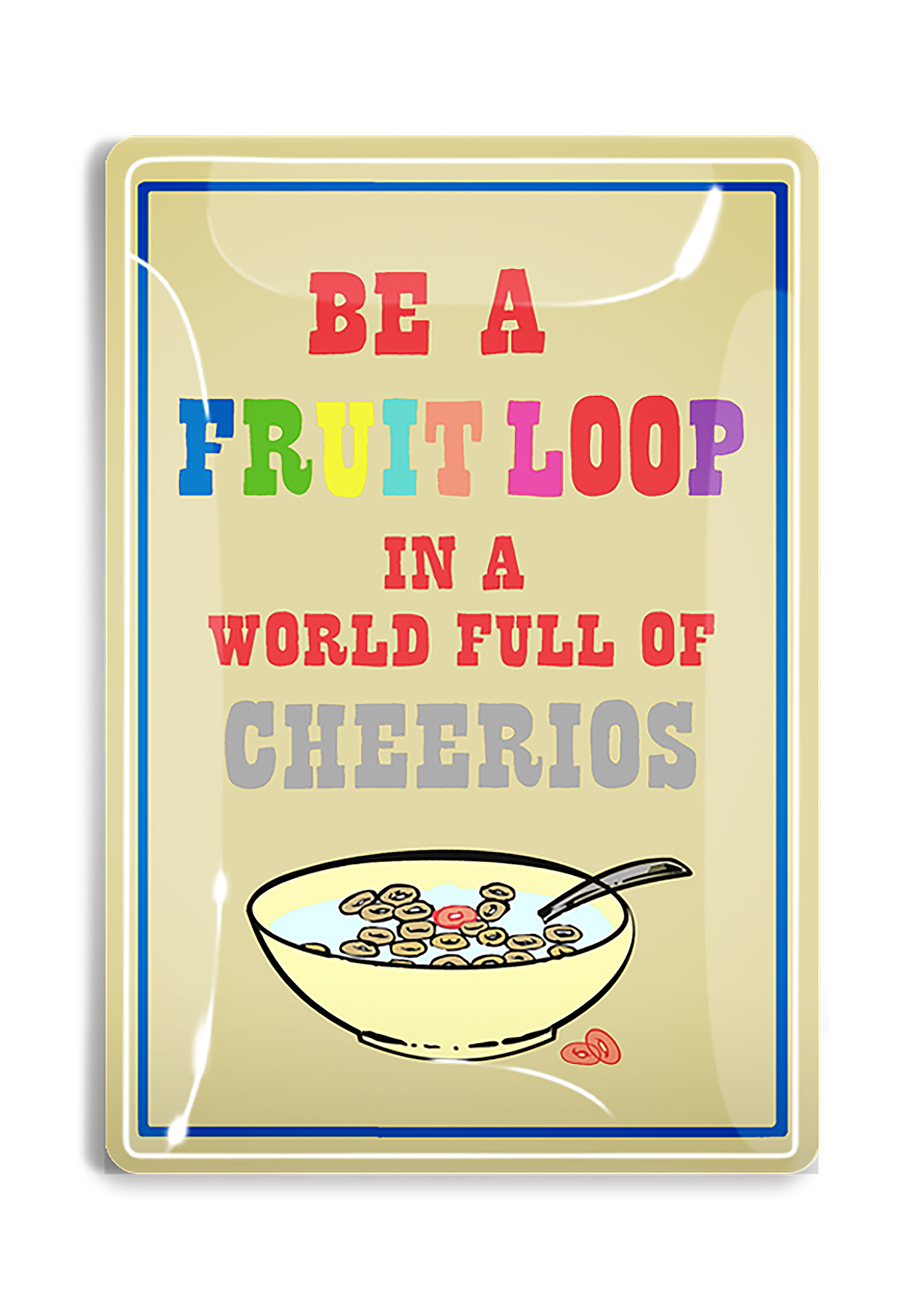 A daily reminder to stand out, stir things up and keep it colorful — the Be A Fruit Loop Glass Decoupage Tray brings a playful dose of attitude to any space. Handcrafted in the classic French découpage tradition, this bent-glass tray features bold typography and a charming cereal illustration. Both food safe and easy to wipe clean, it’s finished with a soft felt backing for a polished touch that protects your surfaces. Perfect for adding a pop of personality to a desk, vanity or coffee table — or hung on the wall or perched on a gallery easel as a cheeky conversation starter. A reminder to be exactly who you are.