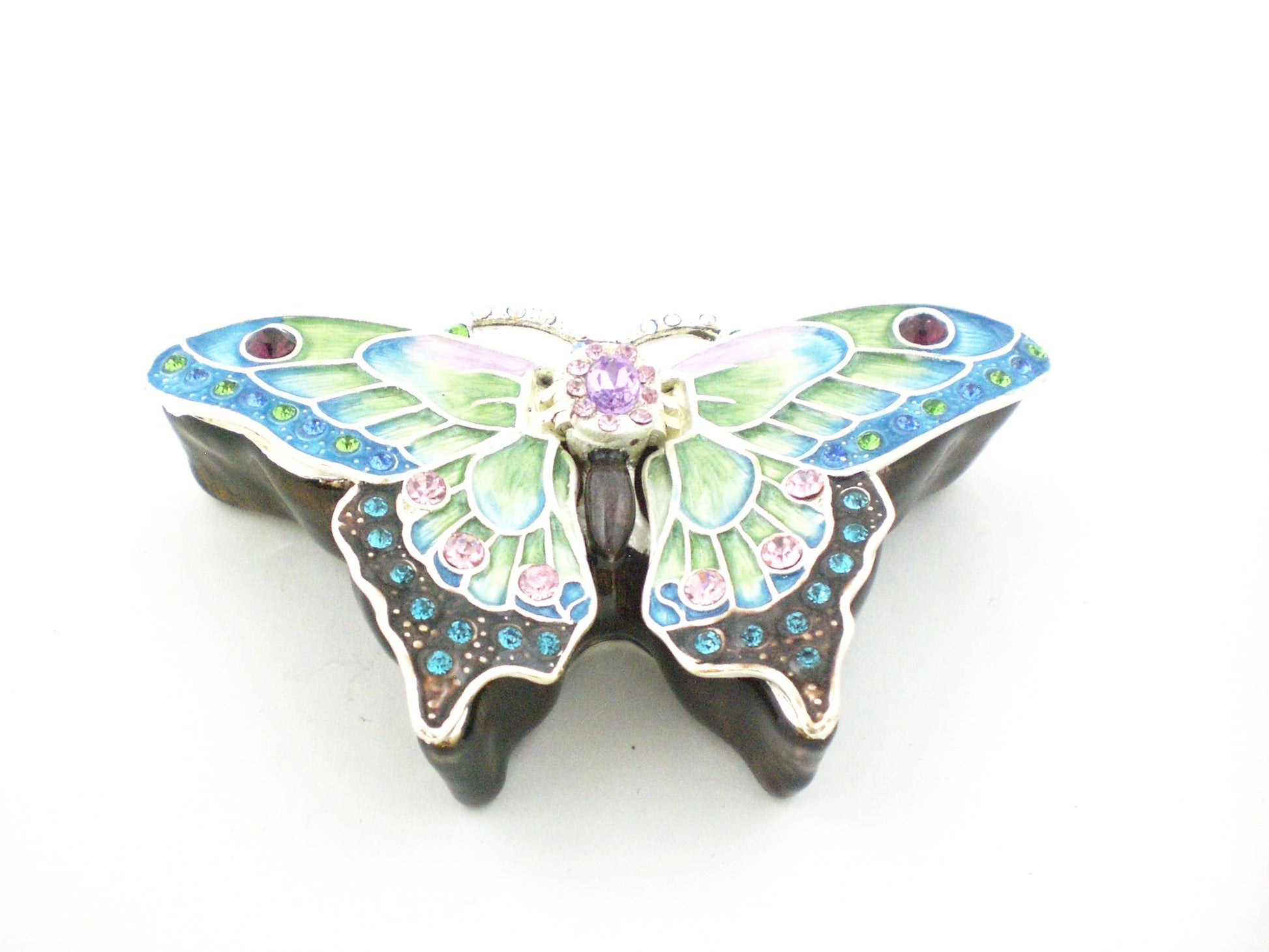 Bejeweled Butterfly Trinket Box. Hand Painted Enamel & Swarovski Crystals. The butterfly trinket box is a unique design. Hand-made by an artist using Swarovski crystal & enamel, copper plating. Inside of box is a lovely enamel. Perfectly made to give away as a gift or keep for your personal collection.