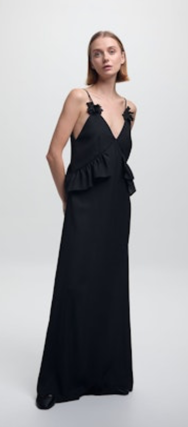 Maxi dress with plunging neckline, straps, ruffle and hand-made flower appliqués, in crepe