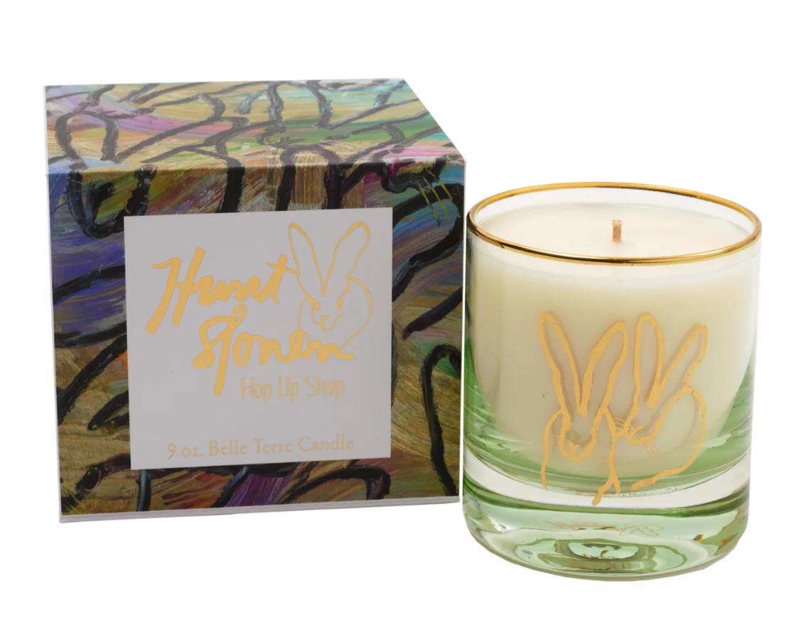 Our new scented candle will bring the garden - complete with gorgeous gardenias and beautiful bunnies- into your home! Our 9 ounce candle is hand-poured right here in the USA, and is housed in our heavy green glass with two of Hunt's gold bunnies on the front and back. Re-use the glass as a votive or for your favorite drink. A perfect gift to give or get.