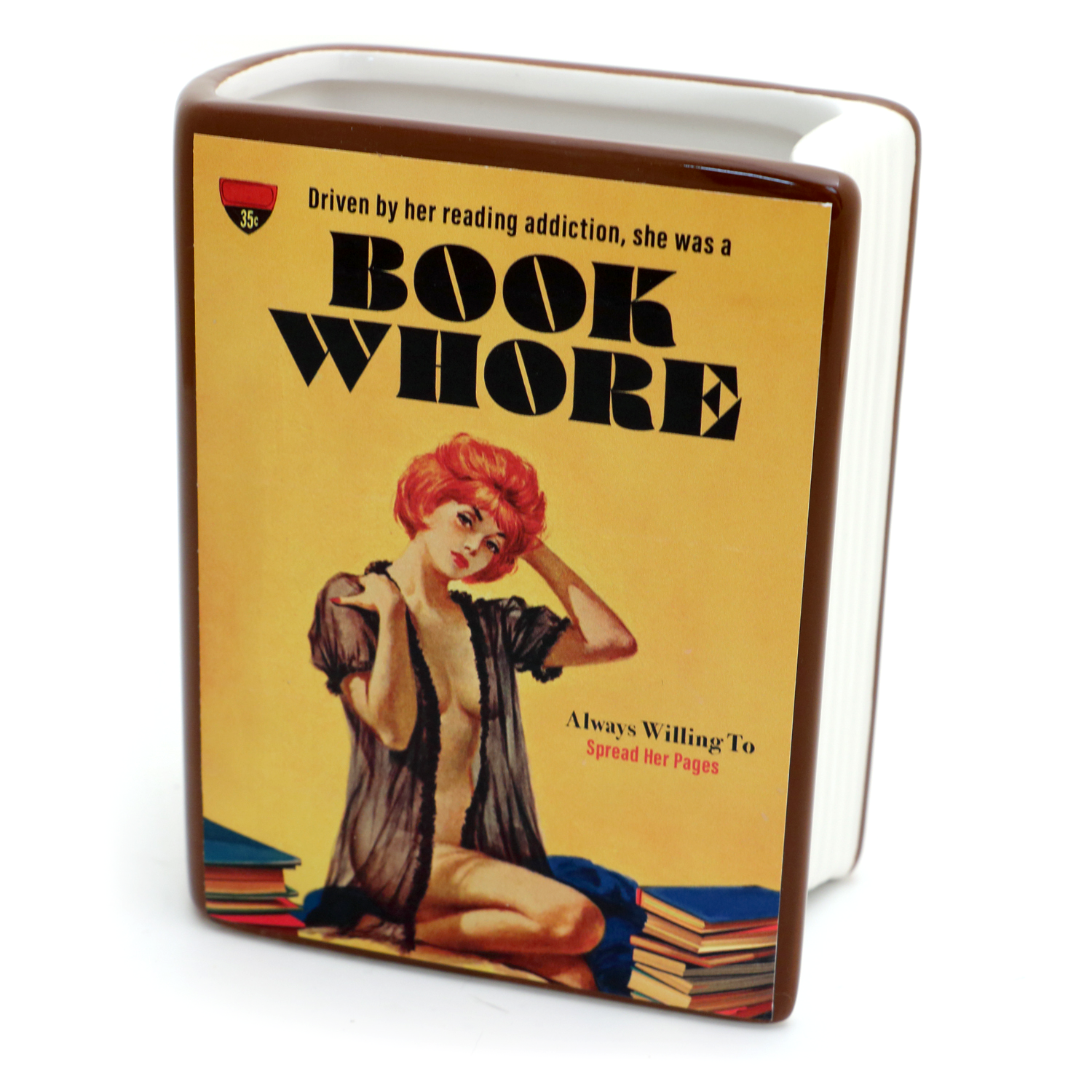 Funny gift for reader. Book Whore. This handmade ceramic container is shaped like a book with a vintage pulp novel cover that reads Driven By her reading Addiction, She was a Book Whore. Always willing to Spread Her Pages. Use it to hold pens and pencils on a desktop or bedside table, or as a fillable container. It is water tight and can be used as a vase. Great little gift for a bibliophile who appreciates a little snarky humor with her literature. Handmade in New Jersey studio from stoneware clay, kiln fired.