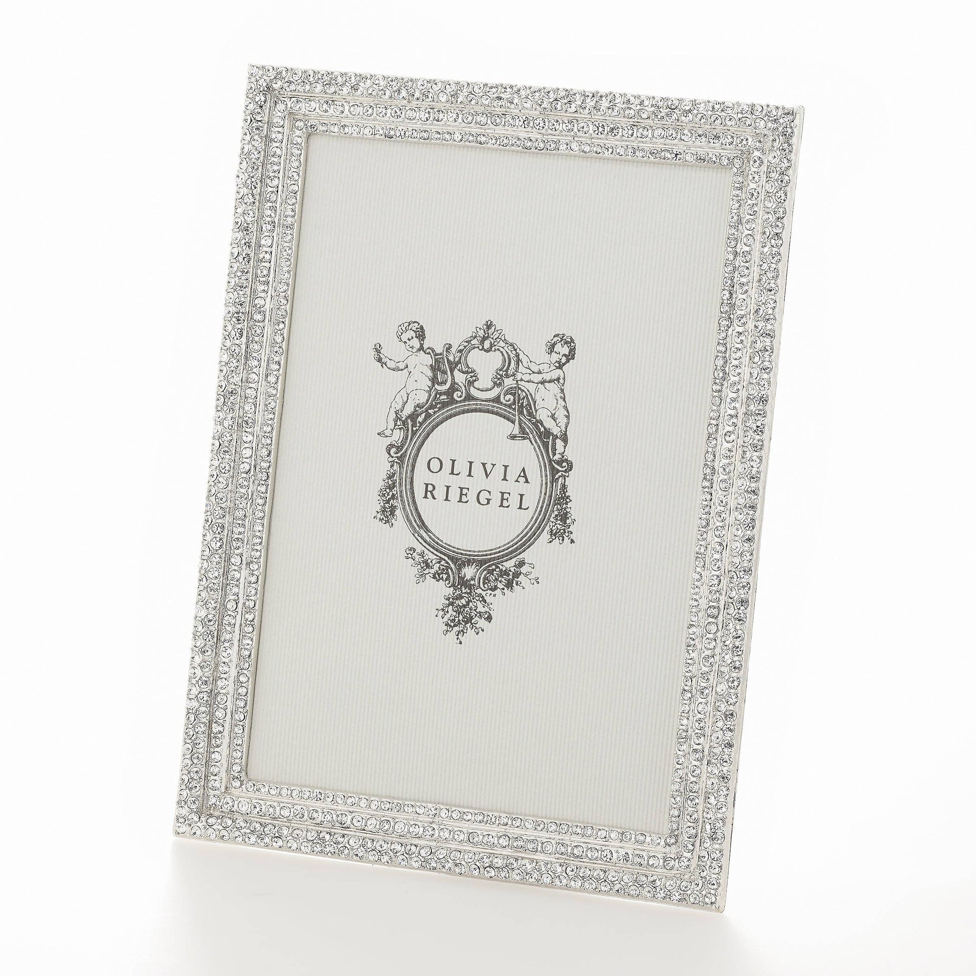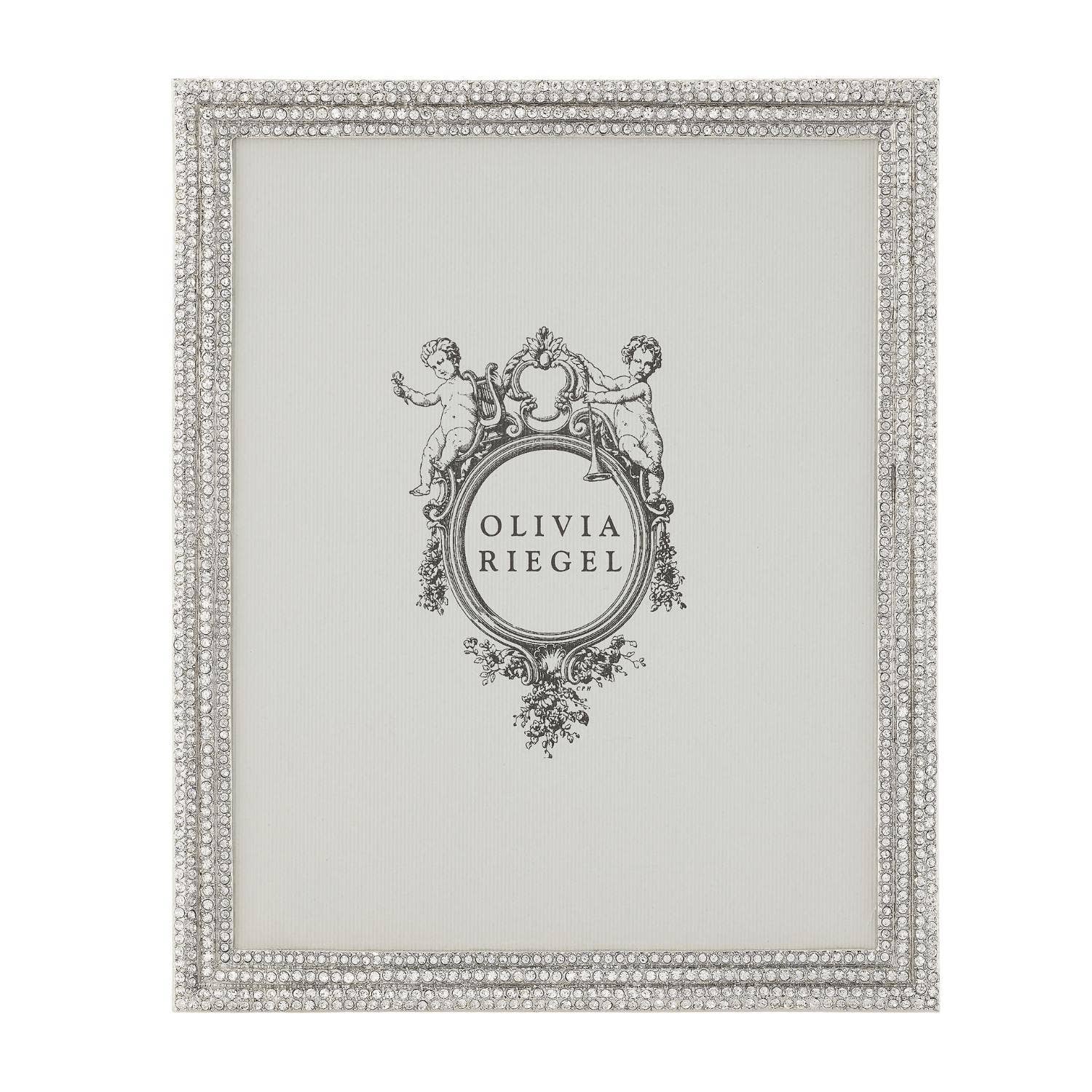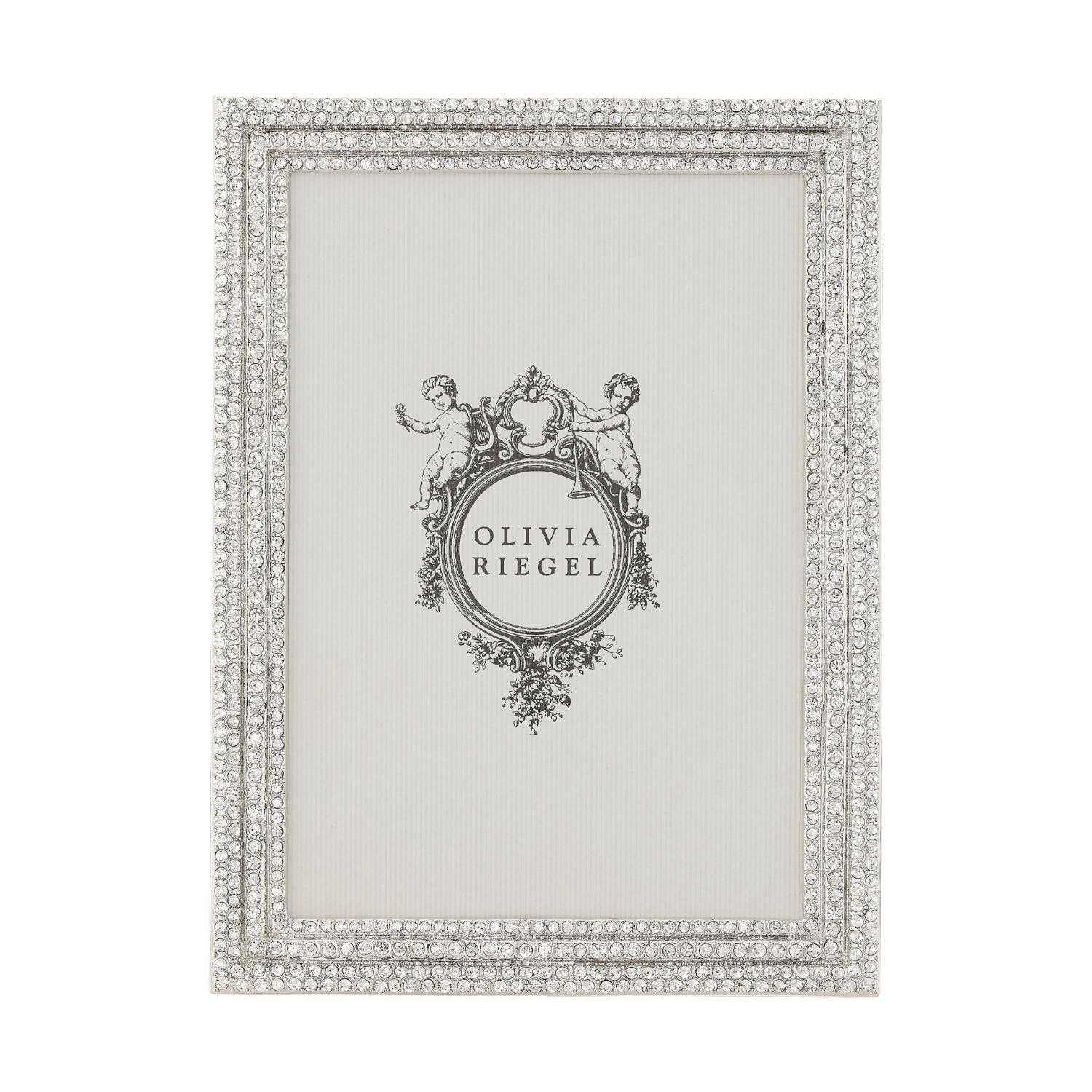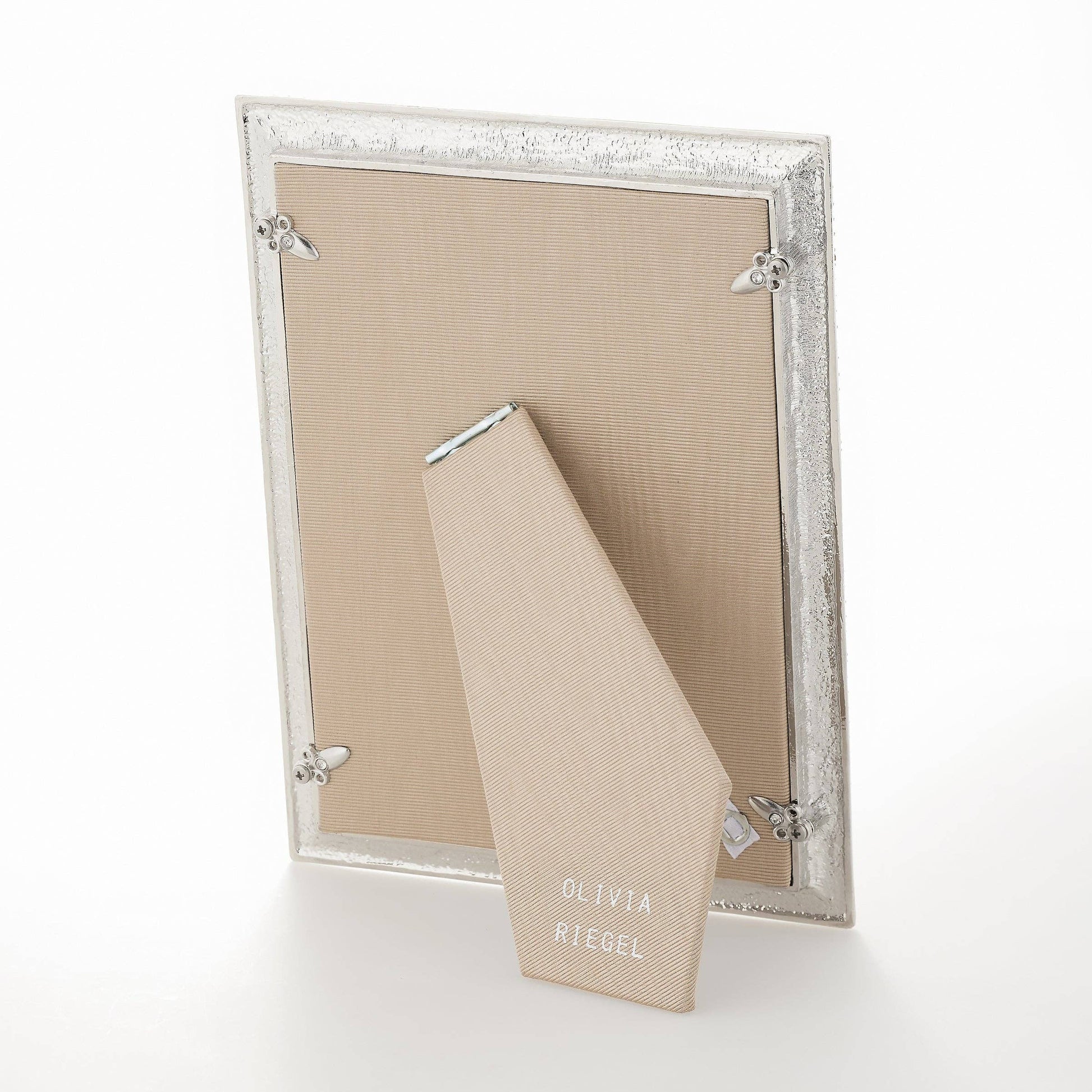 Silver finished pewter, heavily encrusted with rows of hand-set clear European crystal pavé. Beveled glass. Elegant gray moiré silk back, with easel for horizontal or vertical placement. Tarnish resistant.