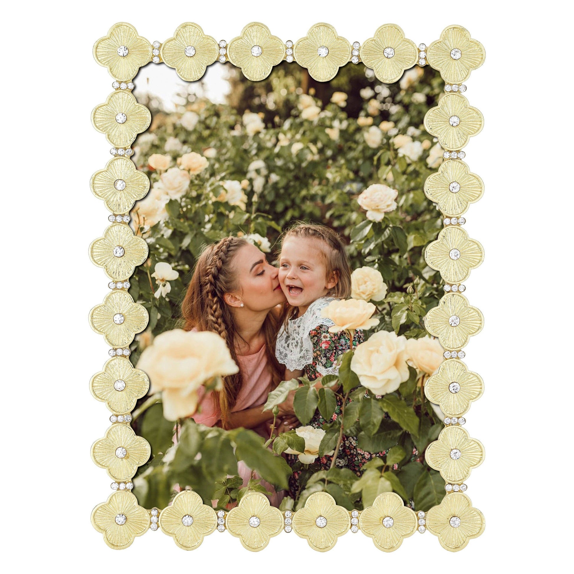 Inspired by the historic quatrefoil design—a decorative element utilized in architecture and the arts for millennia. Gold finished radial-textured pewter, adorned with hand-set clear European crystals. Elegant moiré silk back, with easel designed for vertical or horizontal placement.