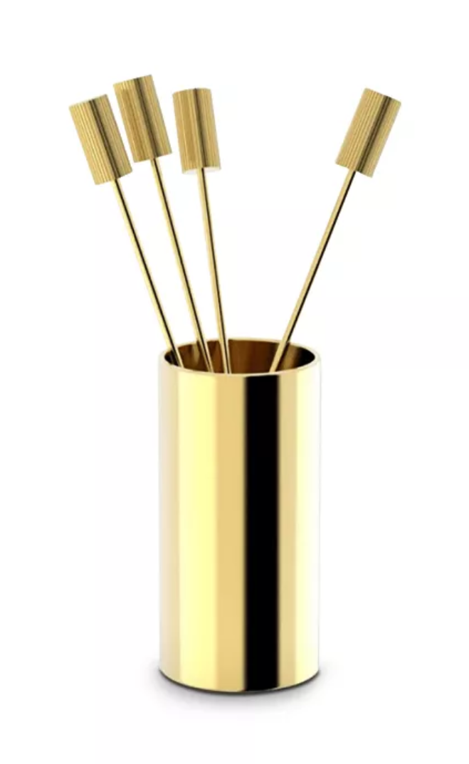 Striations Cocktail picks in gold holder, set of 4