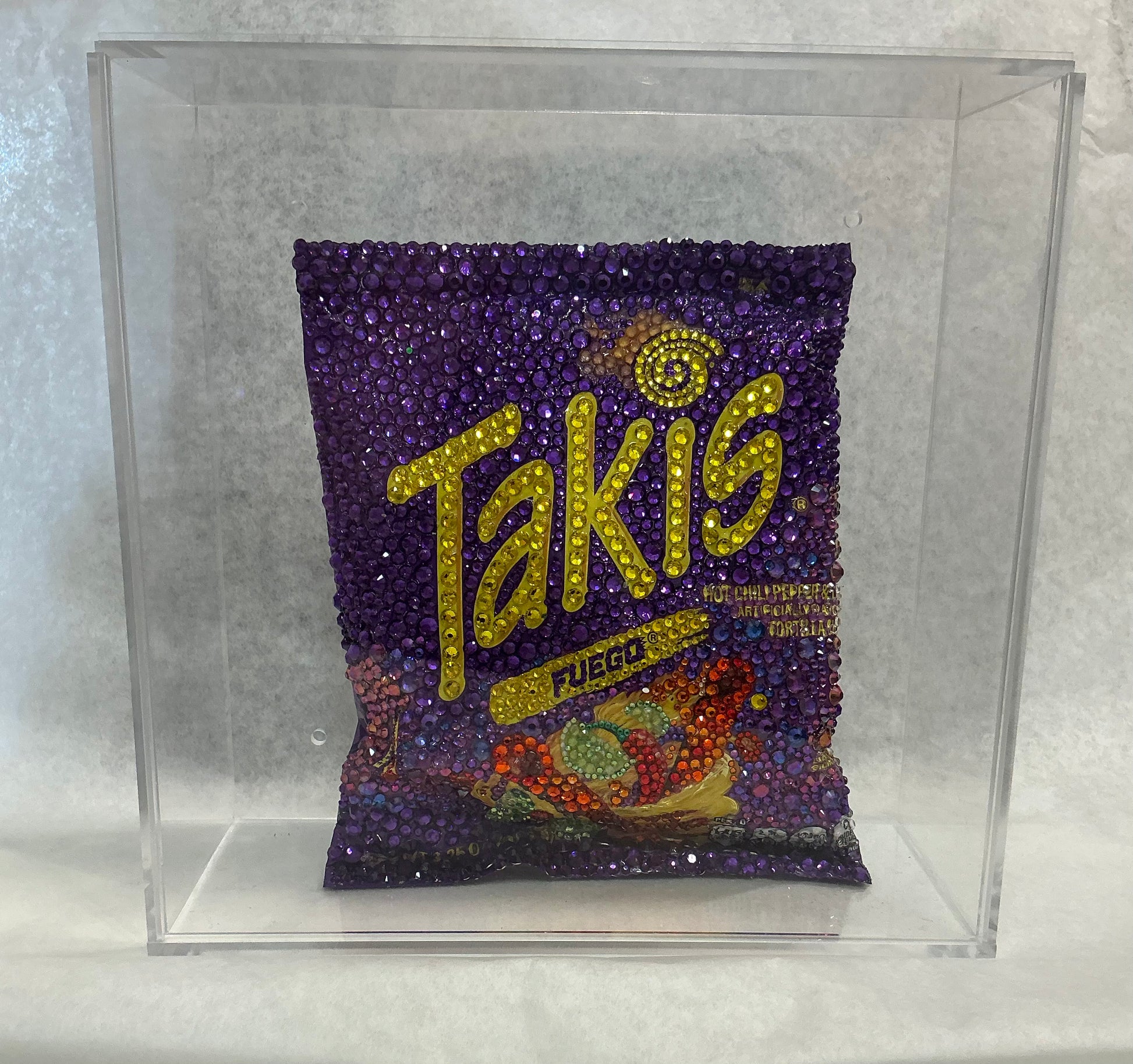 This incredible work of art is one-of-a-kind, made by a very talented local artist. She painstakingly applies one crystal at a time to the bag. She then encases it in a 9”x 9” clear acrylic shadow bow. It can be hung up or placed on a table/shelf. It’s so unique and fabulous and quite the conversation piece.