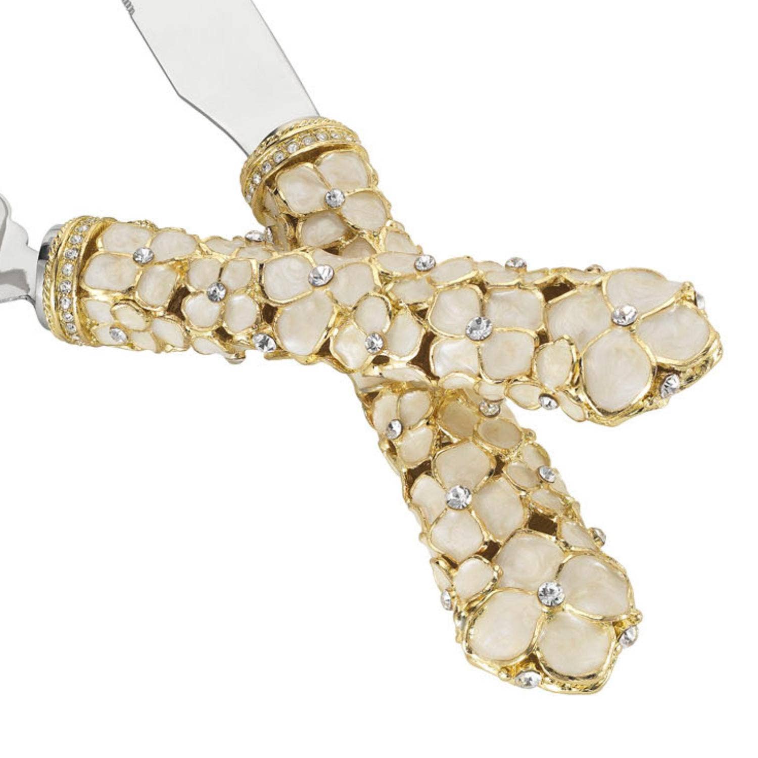 Delicate dogwood blossoms richly cast in gold finished pewter with intricate ivory hued hand-enameling. Hand-set clear European crystals. This dessert serving set features: *Engravable stainless steel blades. * Tarnish resistant. * Hand wash. * These elegant bejeweled pieces incorporate vintage details with a modern sensibility. This serving set is part of the Dogwood collection.