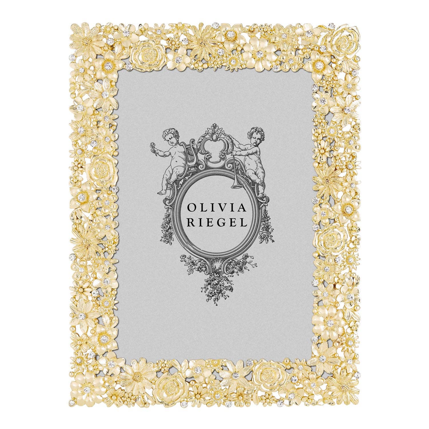 Gold finished pewter garden floral pattern, adorned with hand-set clear European crystals. Elegant gray hued moiré silk back, with easel designed for vertical or horizontal placement. Tarnish resistant.
