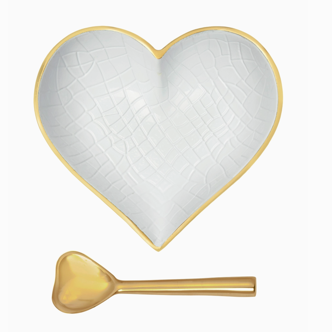Happy Hearts make it easy to show someone your love! They're available in everyone's favorite colors and patterns! Fill 'em with yummy candies, nuts, snack crackers, chips and dips...or use them as colorful catchalls for jewelry and other small items. A shiny gold Heart Spoon comes with every dish.Handcrafted of food-safe polished aluminum.