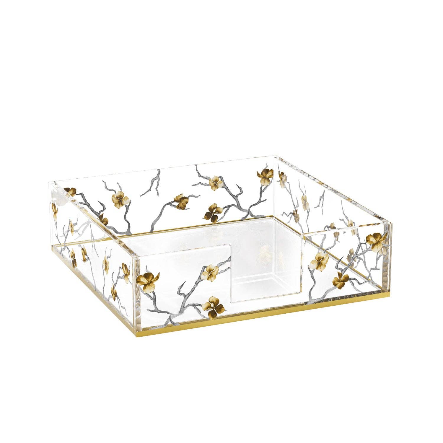 Elevate your dining experience with our Golden Branch Napkin Holder. Crafted with exquisite attention to detail, this holder adds a touch of luxury to your table setting. Its golden branch design exudes elegance and sophistication, making it perfect for special occasions or adding a touch of luxury to everyday dining. * 7" x 7" x 2" Pairs perfectly with the Golden Branch Napkins