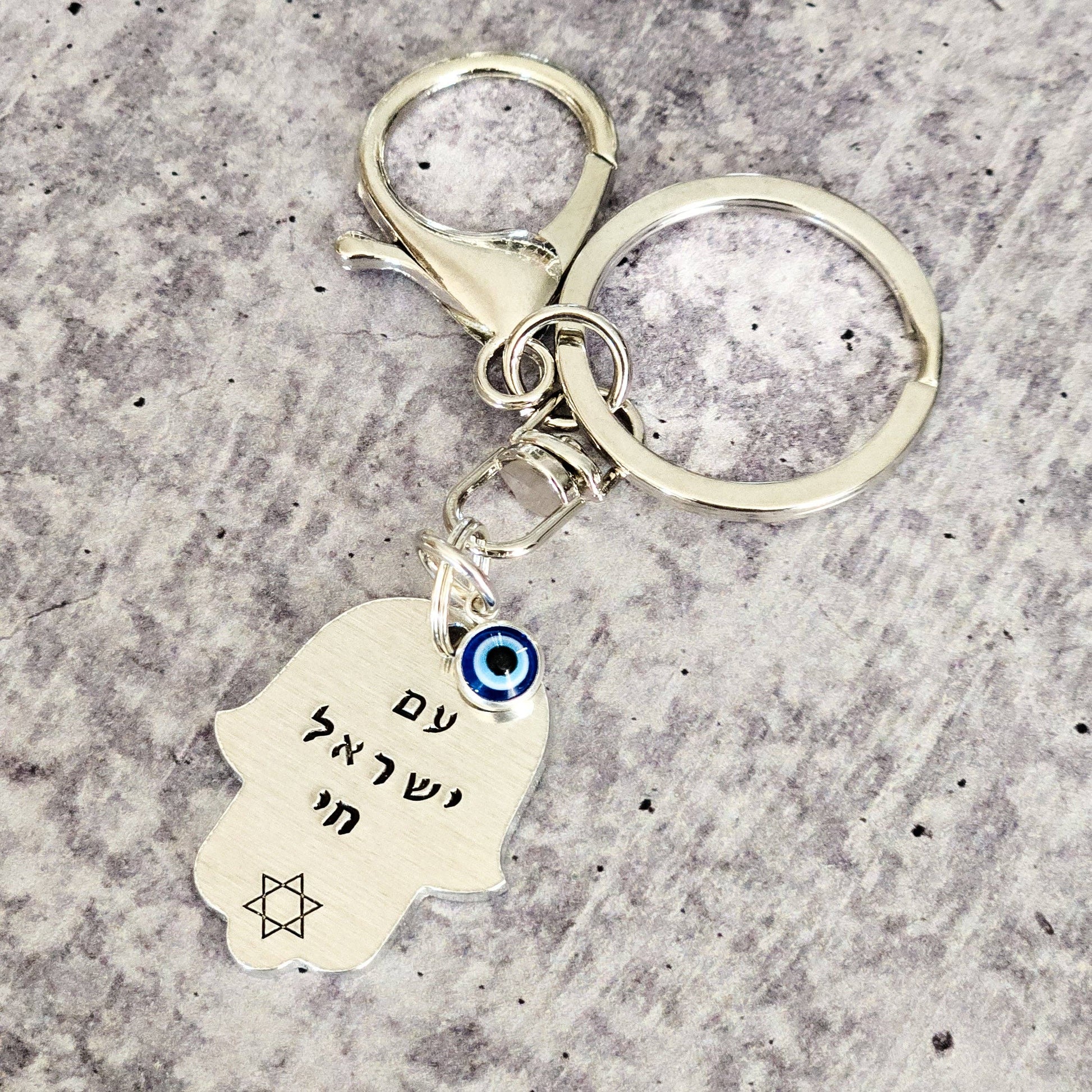 Carry a symbol of Jewish strength and resilience wherever you go. This handmade Hamsa keychain, crafted in brass or aluminum, is hand-stamped with "עם ישראל חי" (Am Yisrael Chai) and a Magen David—a powerful reminder that the Jewish people endure, no matter what.