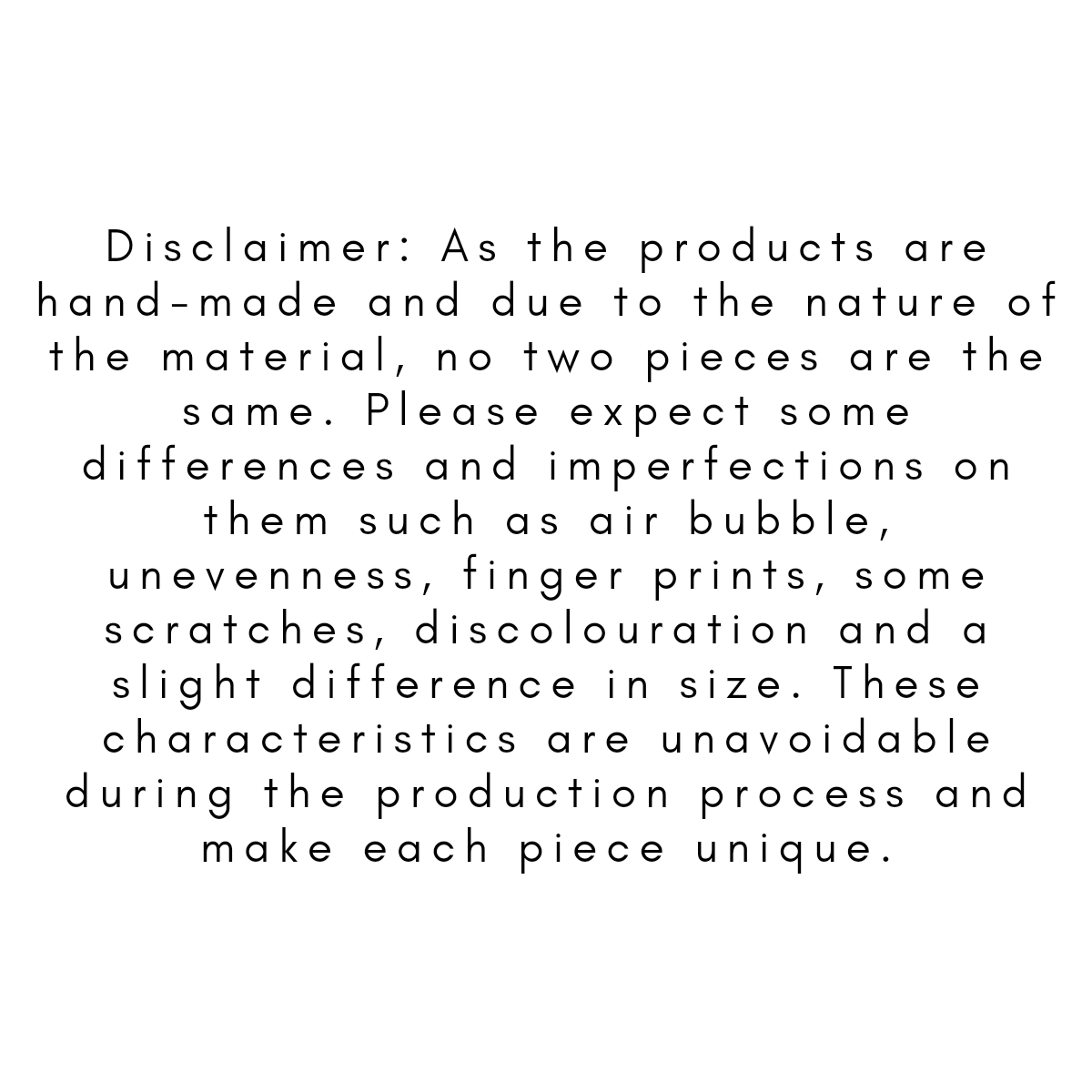 Disclaimer: As the items are hand-made and due to the nature of the material, Please expect some imperfections on them such as a slight unevenness, air bubbles, some scratches, a small difference in color, etc. These characteristics are unavoidable during the production process and they make each tray unique.