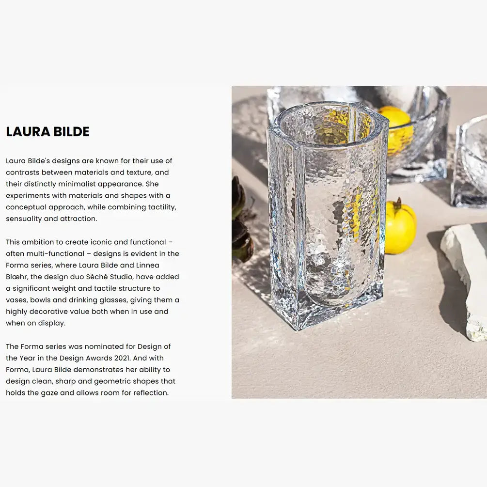 Forma is a product line with heavy sculptural constructions in solid glass, with roots in the historic Bauhaus era, where forms such as cubes, spheres, and cylinders serve as the primary shapes. The strong language of form works with the negative space around the construction and thus how the brain reads the fusion of the forms.