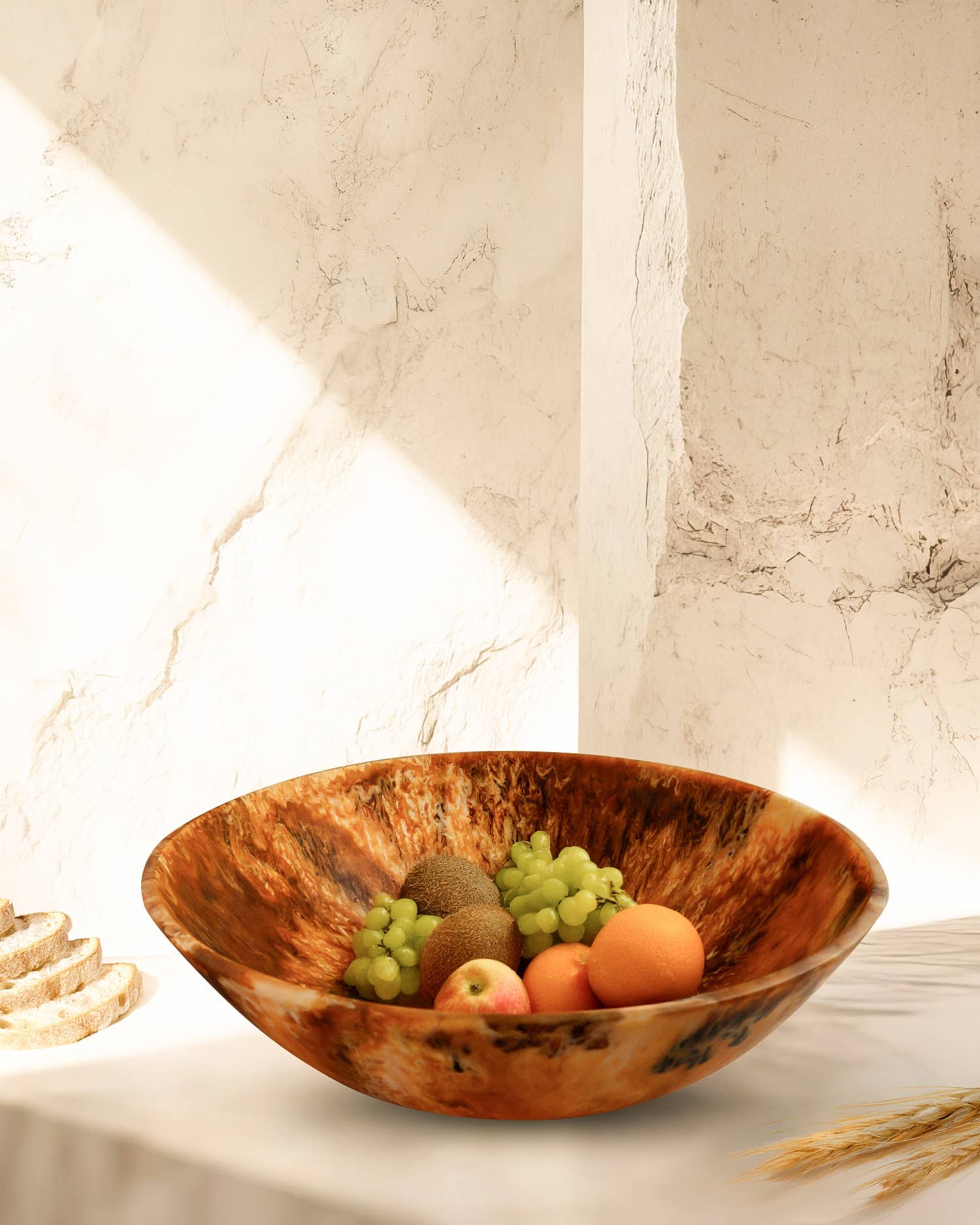 This Matte Tortoise Resin Bowl features a rich, marbled pattern with warm, earthy tones. Its generous 19.5" diameter makes it perfect as a centerpiece or serving bowl. Crafted from durable resin, it offers both style and practicality. The matte finish adds a contemporary touch to its classic design.