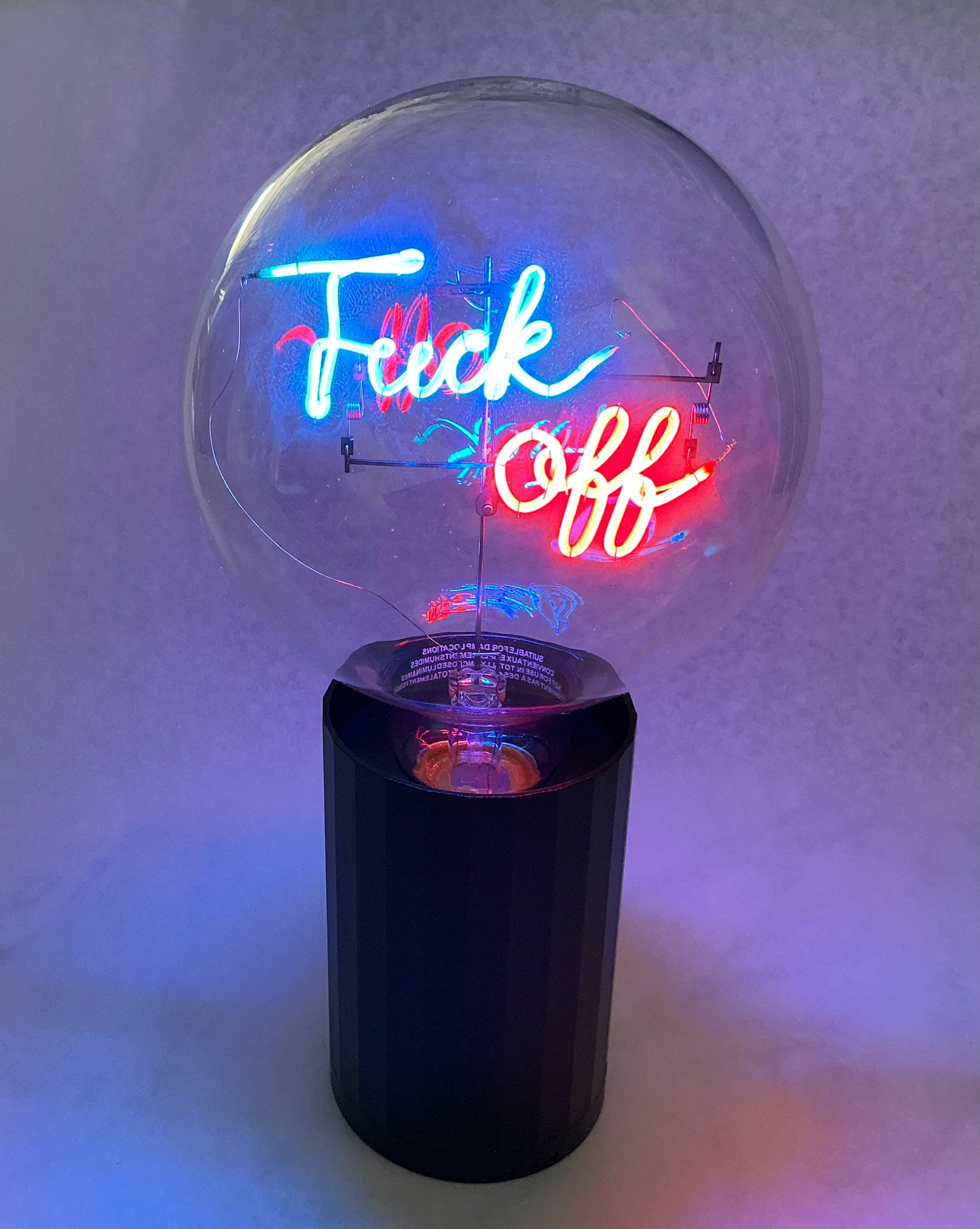 Message in the Bulb (Fuck Off) Red/Blue, with MITB portable lamp base