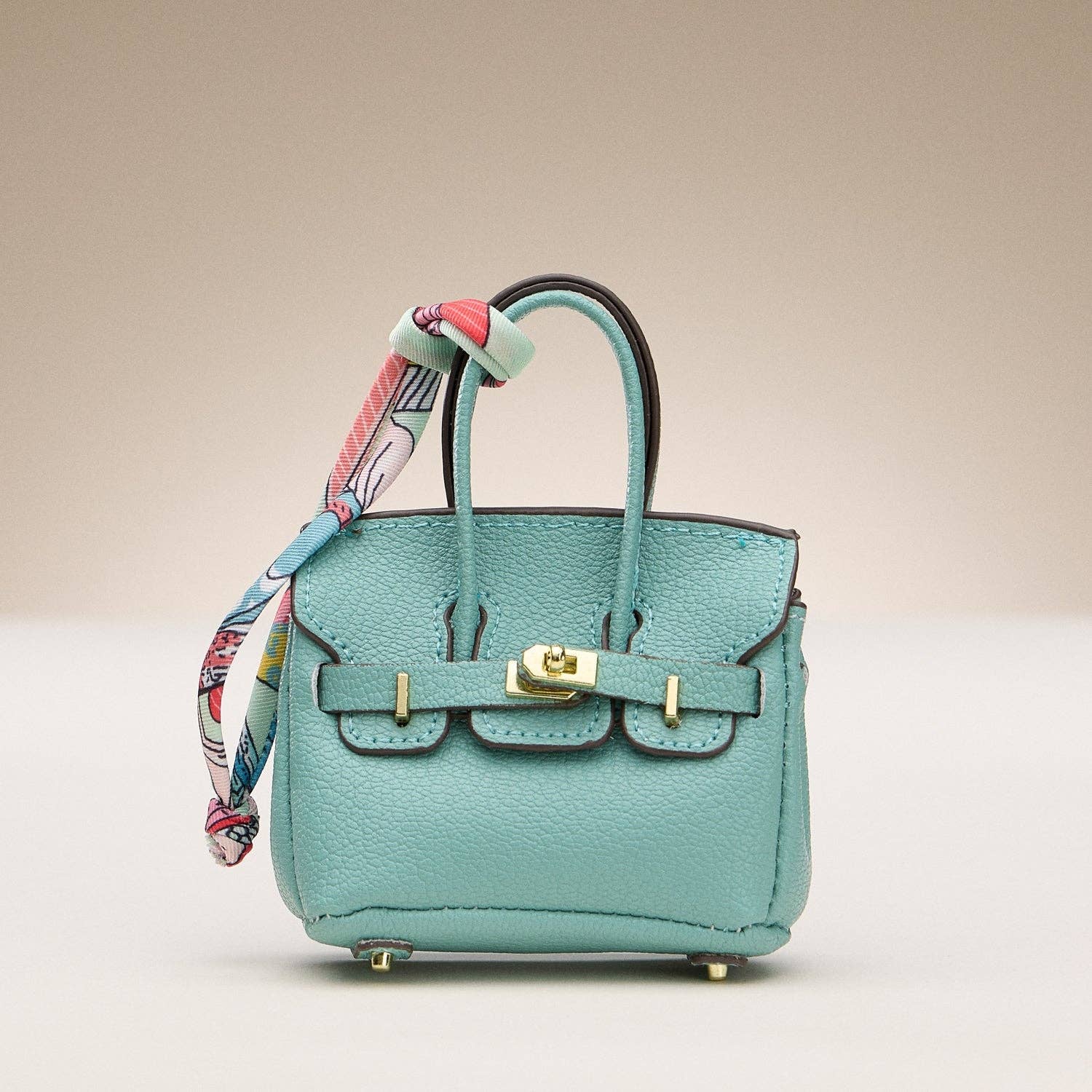 Elevate your handbag game with this Mini Faux Leather Bag Charm, designed to mimic a classic structured purse in a playful micro size. Each charm features gold-tone hardware, a vibrant printed scarf accent, and a polished top-handle silhouette—perfect for clipping onto totes, backpacks, or key rings. Made from durable vegan leather, these charms add a bold and stylish touch to any bag. Available in a variety of eye-catching colors to suit every style.