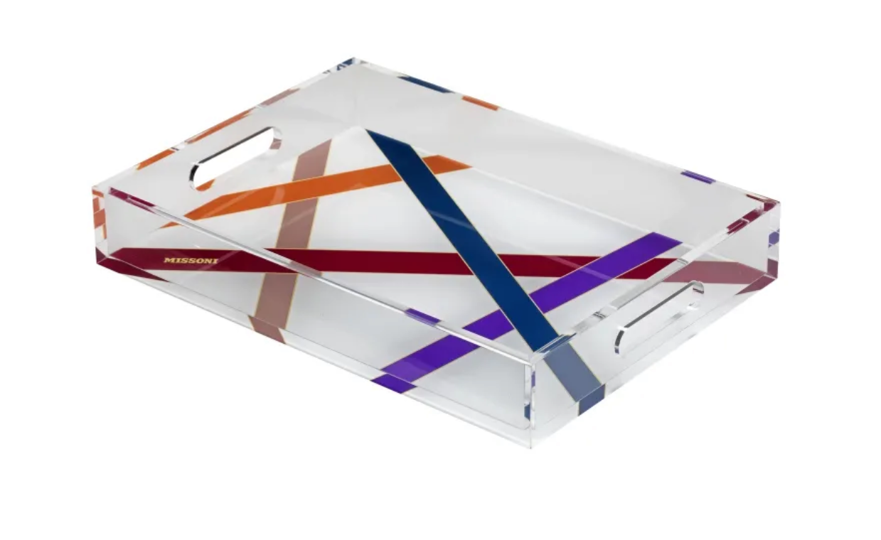 Nastri Multicolor Medium Tray by Missoni is part of a collection focused on harmony, elegance and classicism. The items in this collection are characterized by harmoniously woven ribbons in blue, burgundy, purple, beige, green and orange to create harmony between all the pieces. The products of the Nastri Multicolor collection match any type of furniture. Made of plexiglass, a material that guarantees practicality and resistance; the luxury box in which these items are inserted also makes them a perfect gift. Size: 9.8x 13.8 in