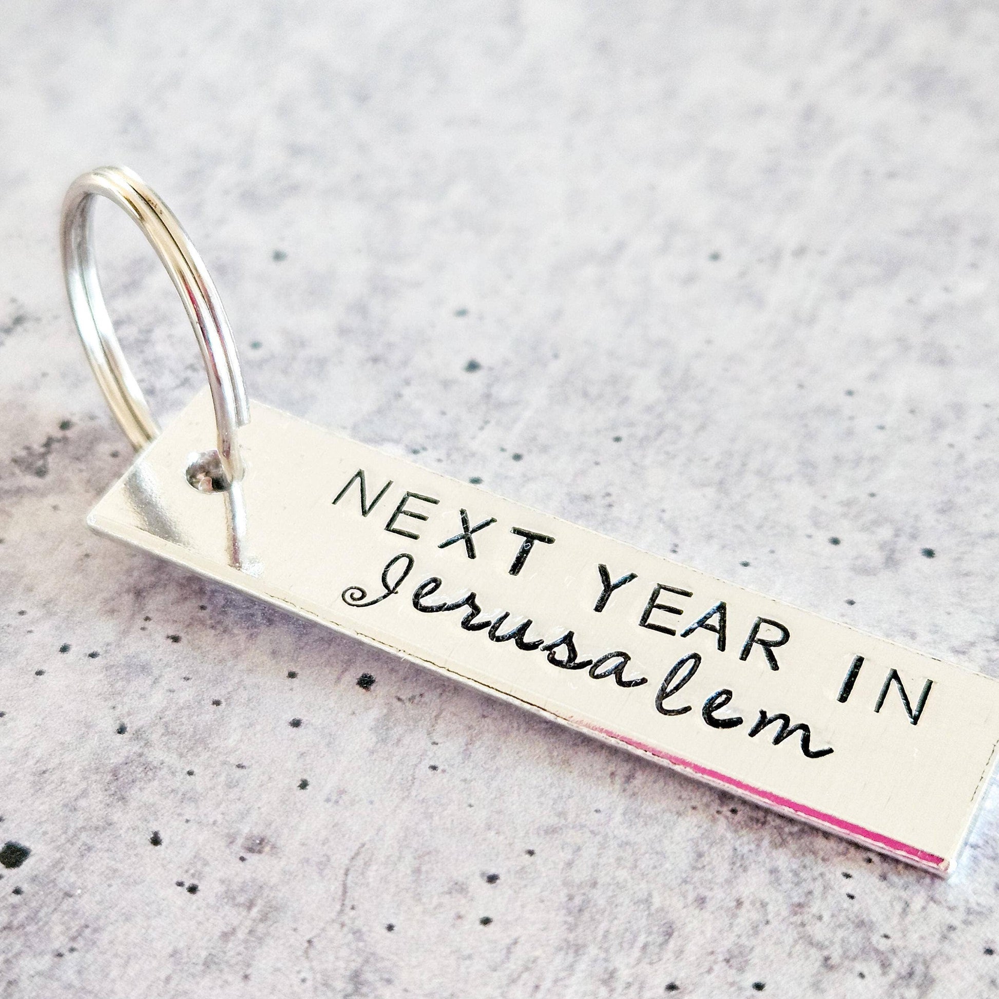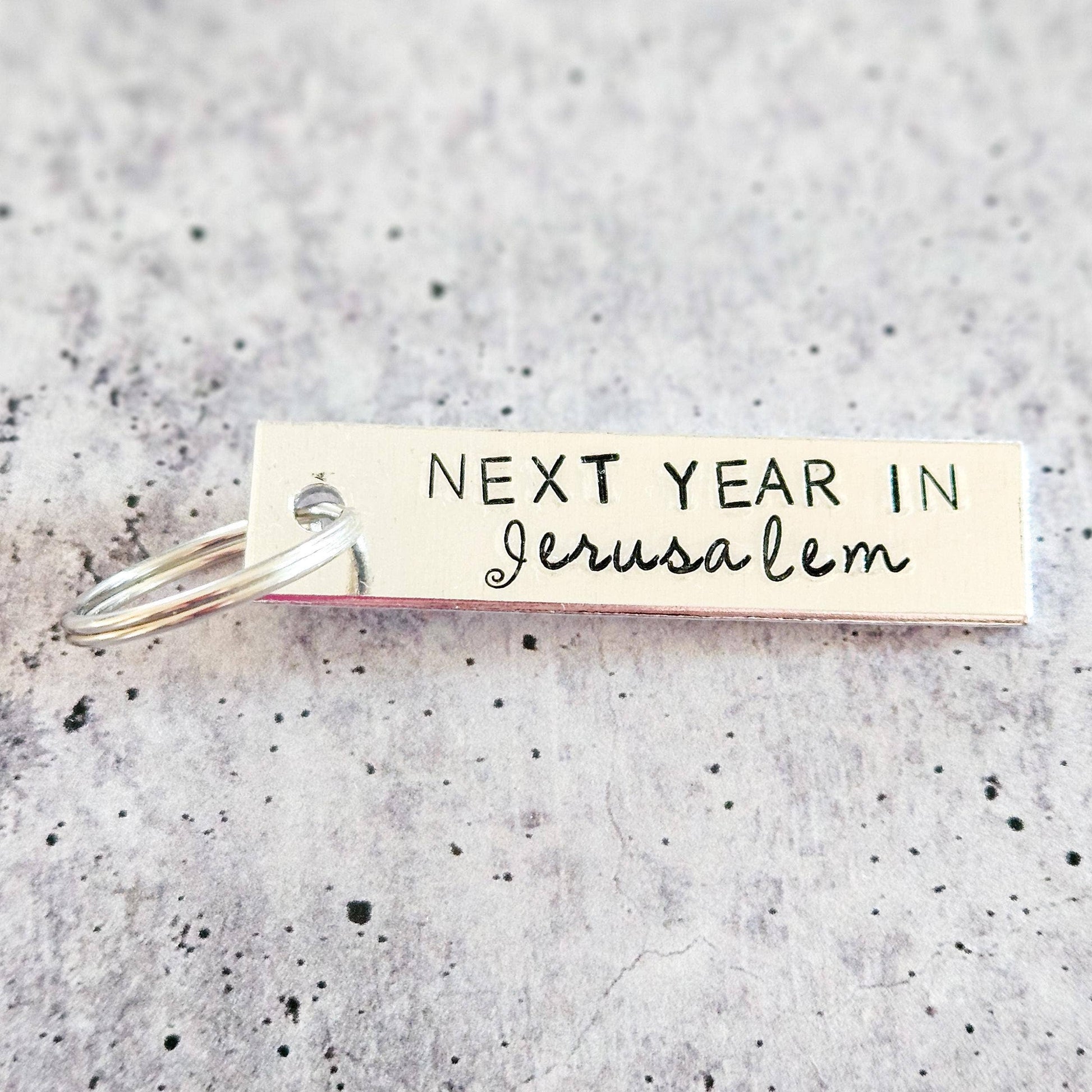 Size: 1/2" x 2" – the ideal size for keys, bags, or even as a thoughtful gift tag "Next year in" stamped in block lettering/"Jerusalem" in a graceful script font Secure keyring included Why You’ll Love It: A meaningful Passover reminder that’s also a daily expression of pride Lightweight and comfortable to carry, yet sturdy enough for everyday use Makes a thoughtful gift for Zionist friends, family, or anyone who holds Jerusalem close to their heart
