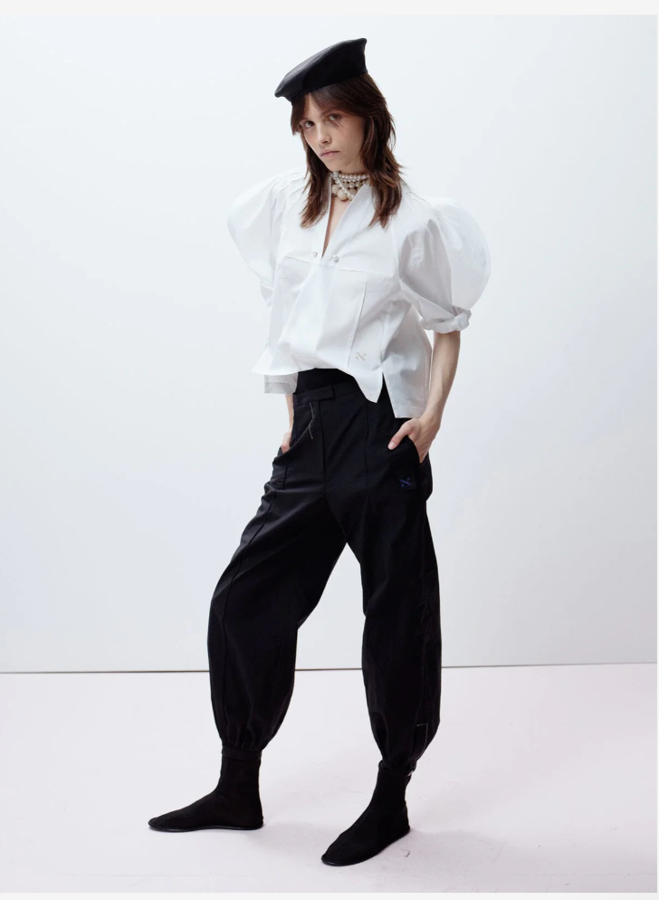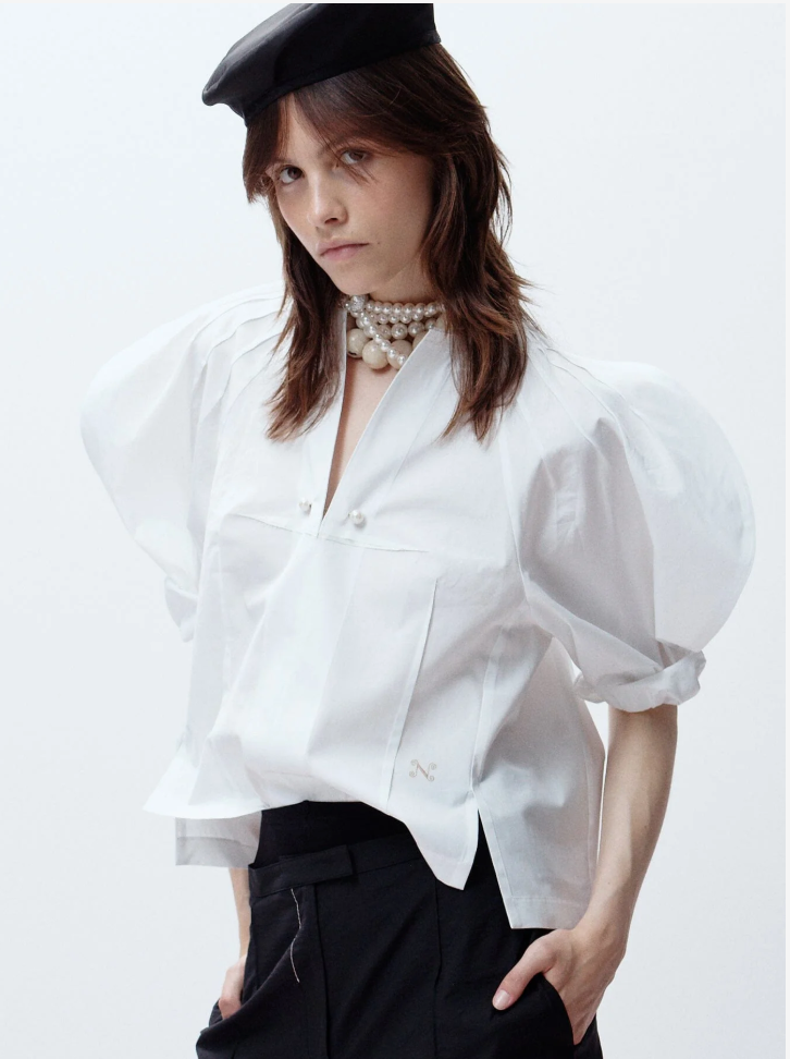 Tapered cuffs along with an open neck and our classic mini double pin. Embroidered ’N’ hallmark. Finely exposed inner raw edging at the neck and cuffs.