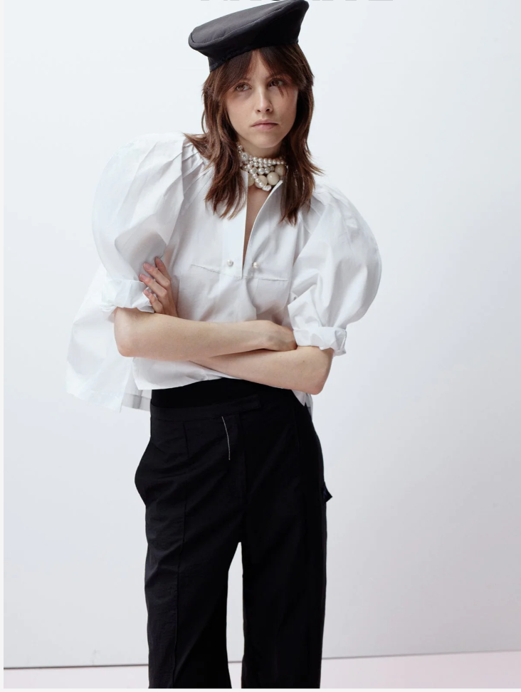 A voluminous shirt with tucks and exaggerated sleeves extending from the neck.