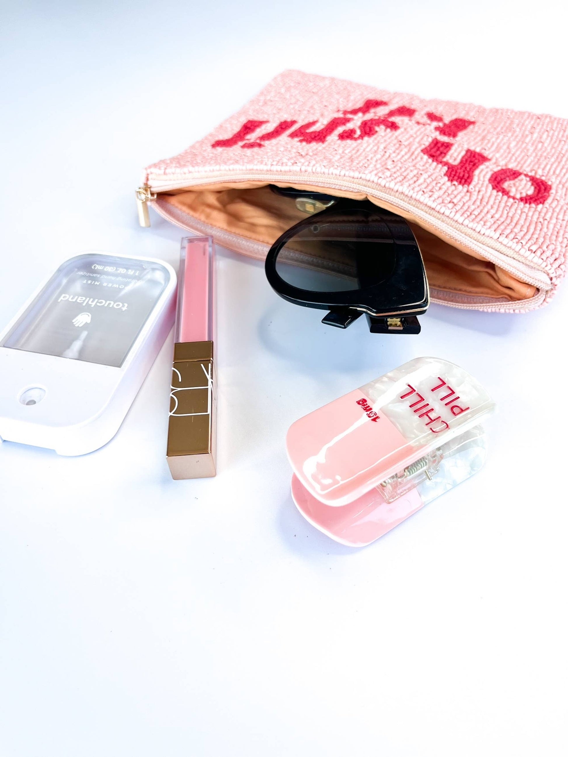 ☆ OH SHIT KIT ☆ Looking for a cute, unique, funny, or inspirational gift item? This extra extra large beaded bag makes for the perfect gift. Great for storing random items in your purse or while you travel. This travel bag beaded on the front and back and made with very high quality materials, your customers are sure to love this one! This style coin purse is much larger than your typical coin pouch and is essentially the size of your average makeup bag. The dimensions are approximately 8 inches wide by 6.5 inches tall and can fit SO MUCH STUFF! ☆ item description ☆ dimensions: 8 x 6.5 inches design is single-sided hand beaded front + back handmade beads