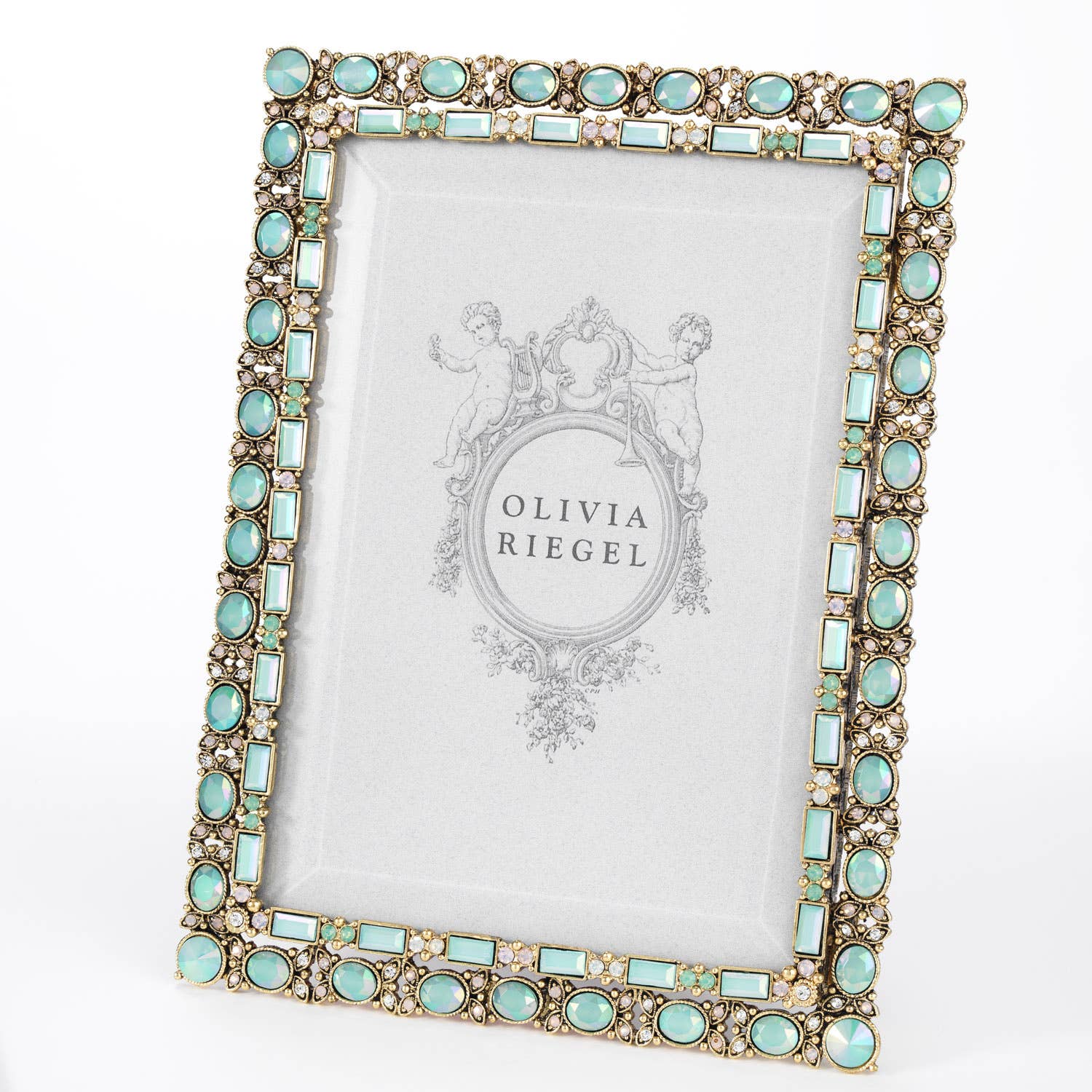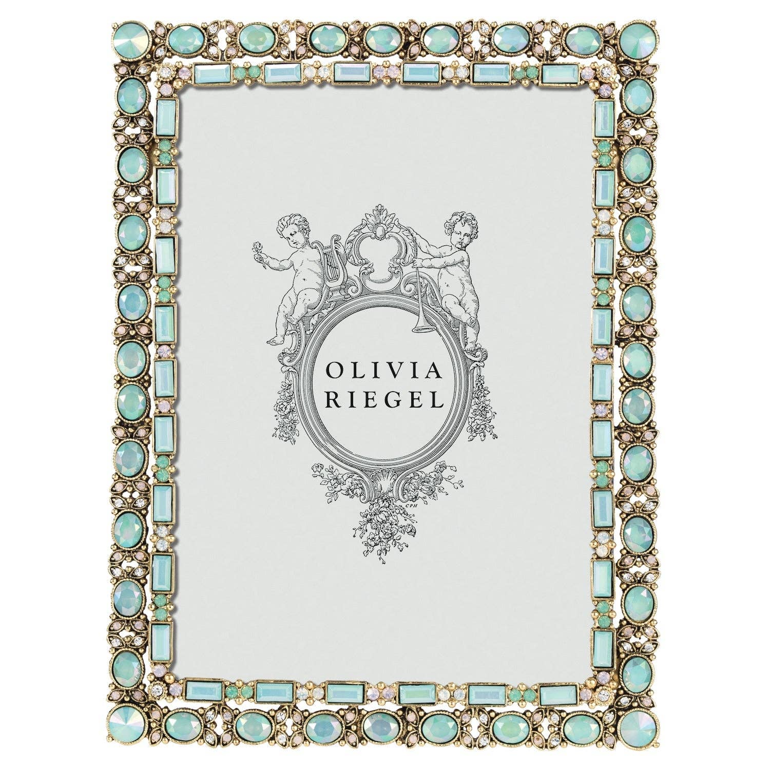 Cast pewter picture frame in gold finish. Hundreds of hand-set European crystals, blue opaline glass gems. This picture frame features: * Holds a 5" x 7" photo. * Beveled glass. * Moiré silk back with easel for horizontal or vertical placement. * Tarnish resistant.