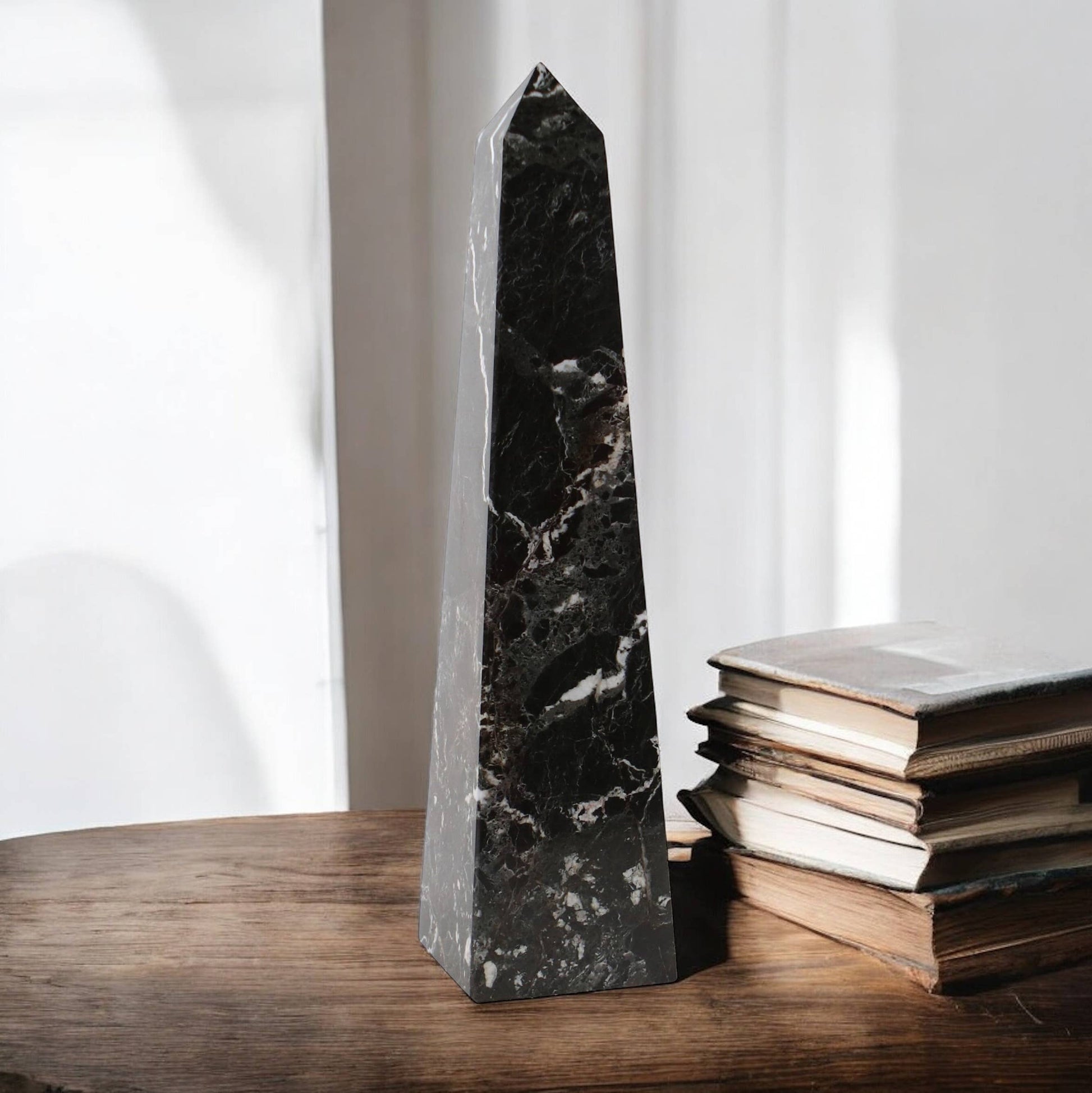 This 5" x 5" x 20" High Polished Finish Black Zebra Marble Obelisk is crafted with a solid block of natural Black Zebra marble. This monumental object is finely carved by hand on a grinder and passed through several rounds of sanding by expert artisans to achieve the gloss. This obelisk comes with protective pads on the bottom to protect the integrity of the surface it is placed on.