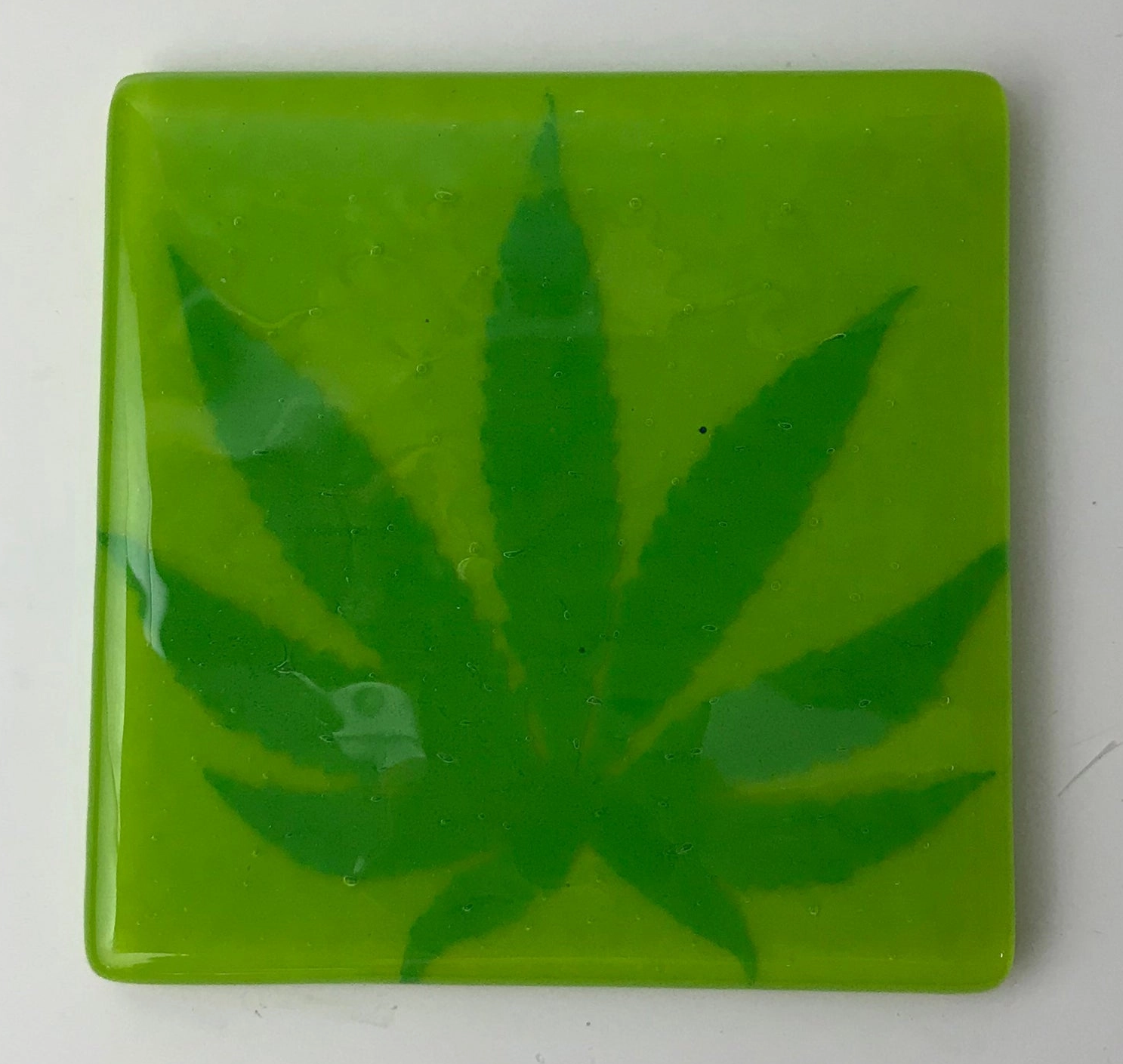 This coaster features a pot leaf design. Multi-functional little art pieces make great gifts, and are a great size (and price) for buyers. This design is perfect for dog lovers. • Cobalt Blue glass, printed in bronze mica • 4" square, with rubber bumpons on bottom • Dishwasher safe • Handmade in the USA Coasters are screen printed, fused glass. Glass is cut, and screen printed by hand with fine glass enamels, then fused overnight to 1415 degrees in a kiln.