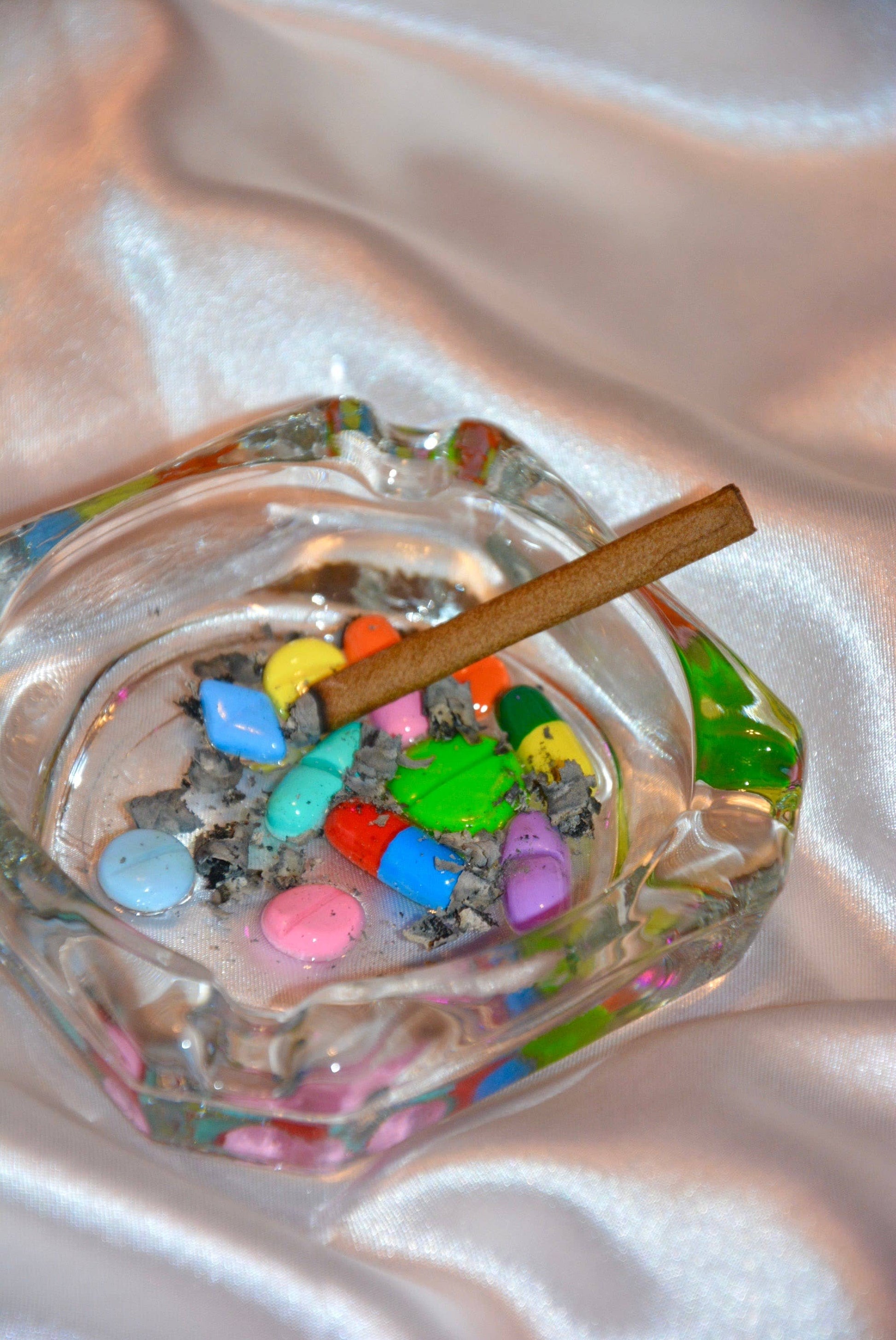 We wouldn't normally condone pill popping, but don't worry, this ashtray has been officially prescribed. Featuring ceramic pills in various colors, your ashtray never looked so happy! Details: - Functional for regular use as an ashtray. Materials: Ceramic pills/Glass vessel/Resin/Acrylic paint - Dimensions: 3.66” L x 3.66” W x 2.5” H - Quantity: 1 - This piece is handcrafted and therefore may not be an exact replica of the picture. Please embrace unique variations such as slight color differences. - Avoid long-term exposure to direct sunlight and LED light to keep colors bright.