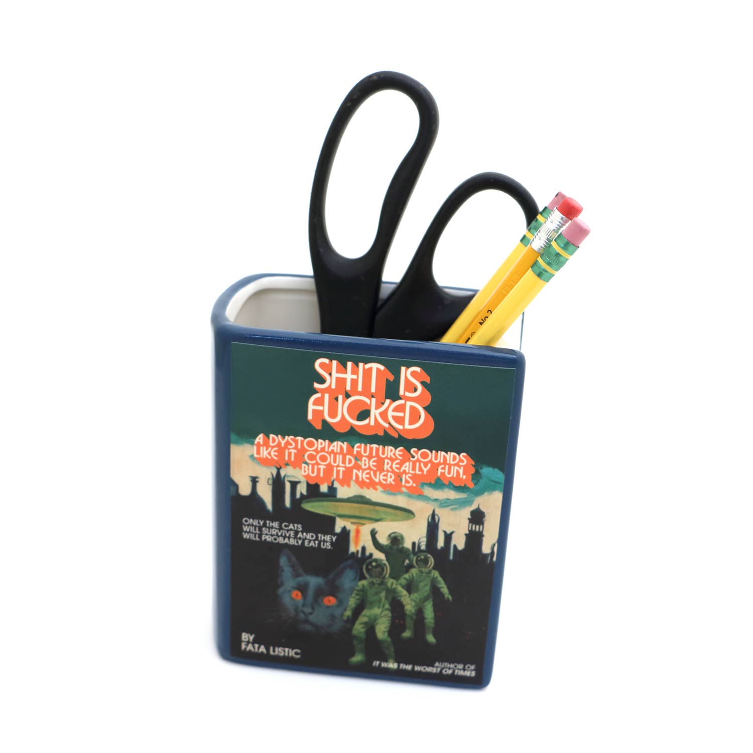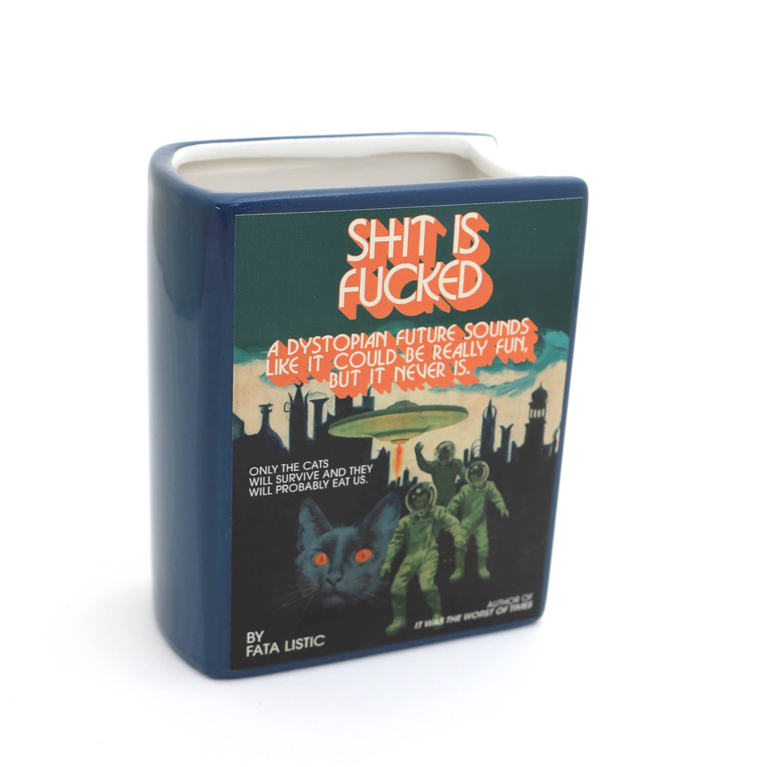 Shit is Fucked. A Dystopian Future Sounds Like it Could Be Really Fun, But it Never is. Only the Cats Will Survive and they Will Probably Eat Us. This handmade ceramic container is shaped like a small book. Use it to hold pens and pencils on a desktop or bedside table, or as a fillable container. It is water tight and can be used as a vase. Great gift for a book lover who follows politics and enjoys Science Fiction. Handmade in New Jersey studio from stoneware clay, kiln fired.