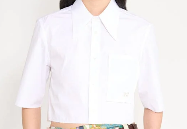 Crop shirt with pointy collar and faux front pockets. Raw edging throughout. Hallmark 'N' embroidery.