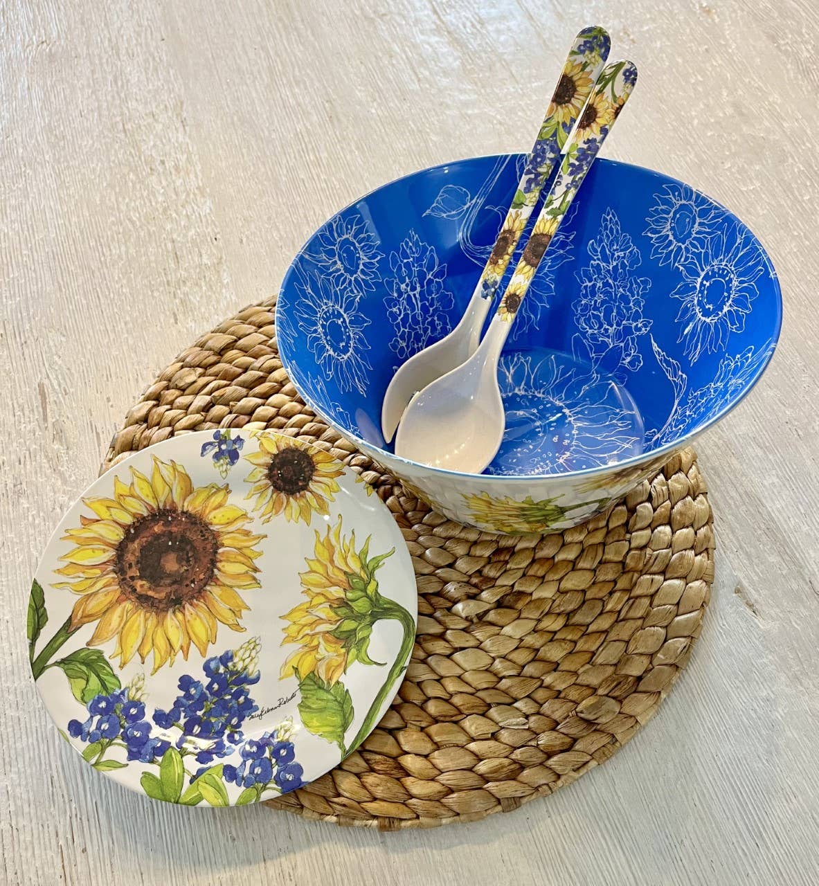 Sunflower & Bluebonnets Floral Bamboo Serving Salad Bowl and Servers