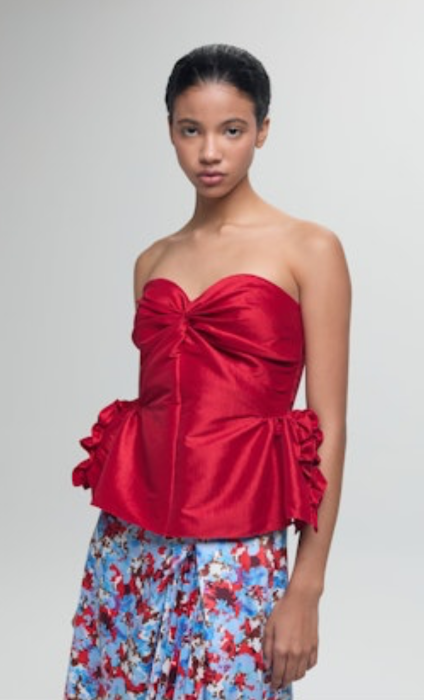 Strapless red bustier top with sweetheart knotted neckline , gathering, slit and ruffle detail on the waist, cotton