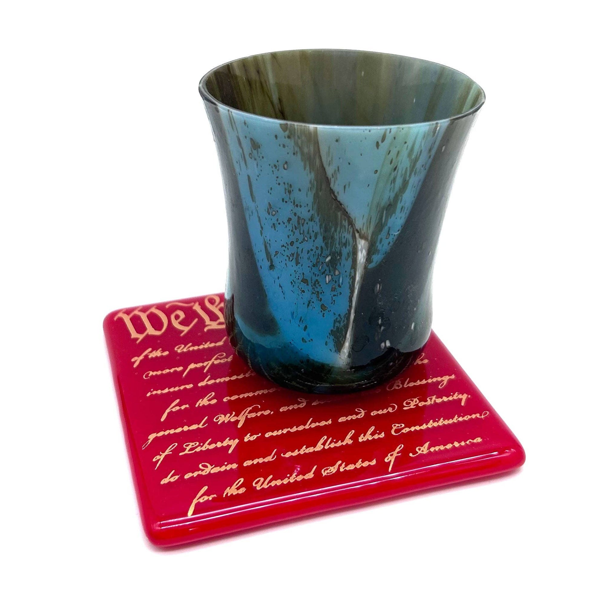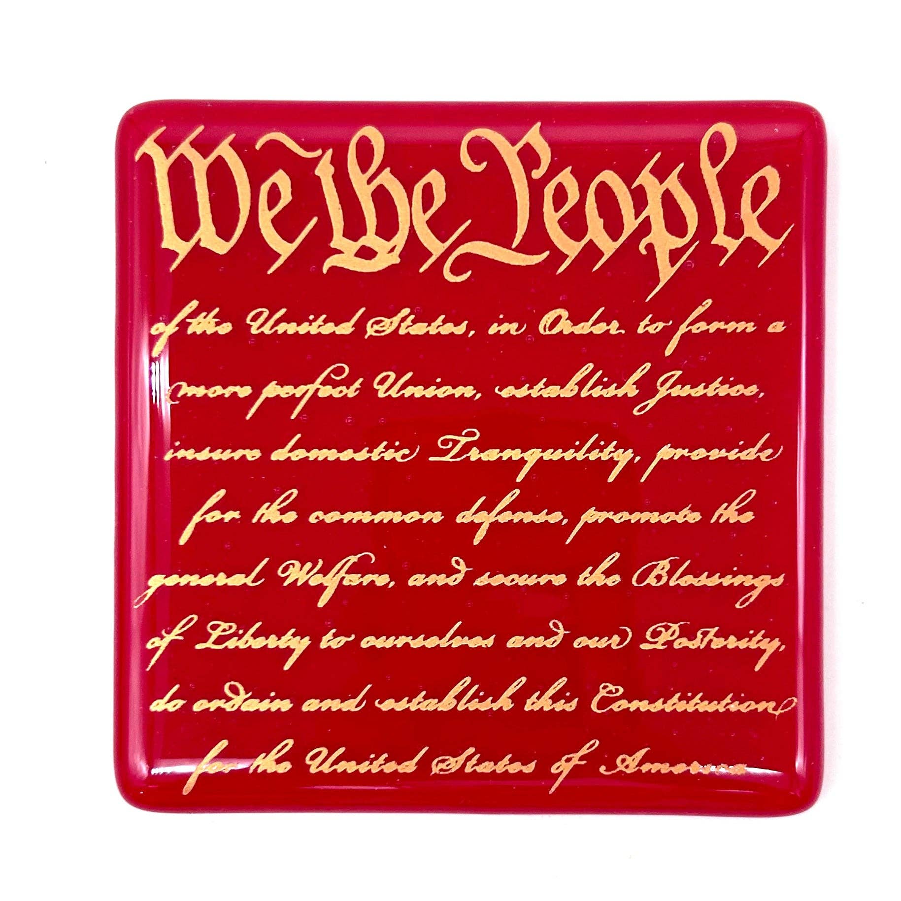This coaster features text from the Preamble to the US Constitution: "We the People of the United States, in Order to form a more perfect Union, establish Justice, insure domestic Tranquility, provide for the common defense, promote the general Welfare, and secure the Blessings of Liberty to ourselves and our Posterity, do ordain and establish this Constitution for the United States of America." Multi-functional little art pieces make great gifts, and are a great size (and price) for buyers. This design is perfect for every American. * Red glass, printed in sparkle gold mica * 4" square, with rubber bumpons on bottom * Dishwasher safe * Handmade Coasters are screen printed, fused glass. Glass is cut, and screen printed by hand with fine glass enamels, then fused overnight to 1415 degrees in a kiln.
