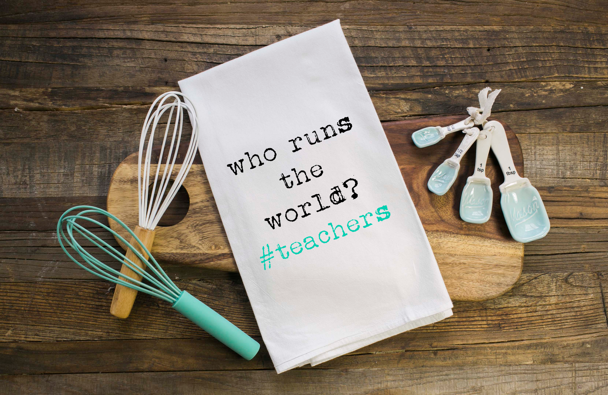 Teacher appreciation gift with 100% true phrase "Who Runs the World #teachers" This teacher towel makes the perfect gifting for Gift Exchanges, Teacher Gifts, stocking stuffers and novelty.