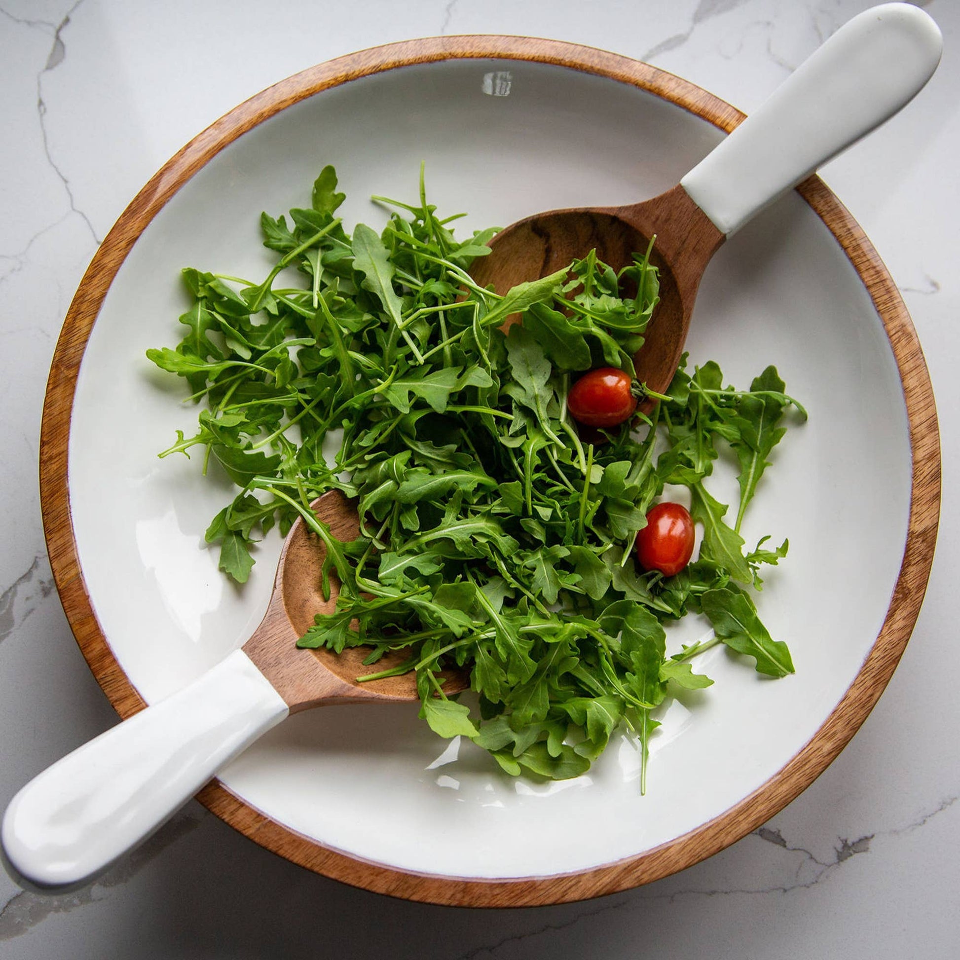 These salad servers are crafted from high-quality acacia wood, renowned for its durability and unique grain patterns. The white enamel coating provides a modern twist and creates a protective layer that makes these salad servers resistant to scratches and stains. The enamel also creates cleaning a breeze, ensuring that these salad servers are always ready to be used. Measurements: 4" W X 10" L X 1" Hand wash with mild soap. Complete your modern decor with sustainable kitchenware. High-quality and durable wooden salad servers, featuring a unique grain pattern that makes each set one-of-a-kind. These modern and stylish salad servers are perfect hostess gift or for anyone that loves entertaining.
